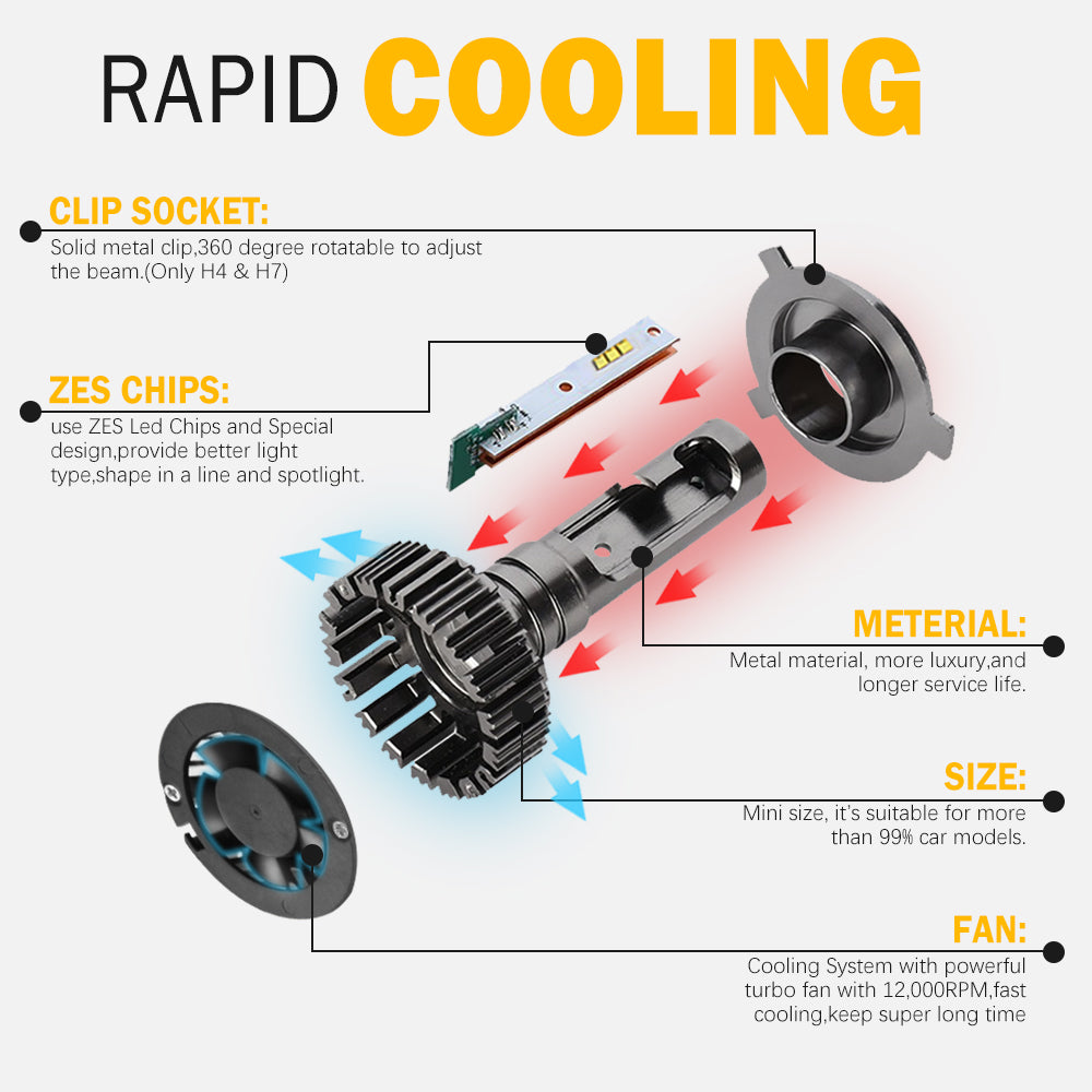 8000lm Cooling Fan 6500K Car H11 9005 9006 Led Bulb Auto F2 ZES H7 Led H4 Led Headlight