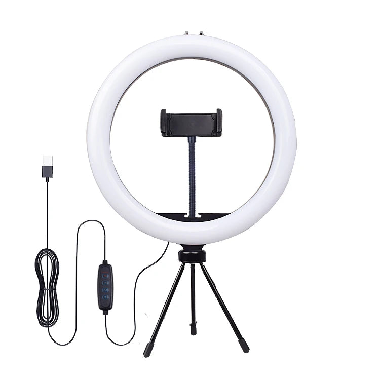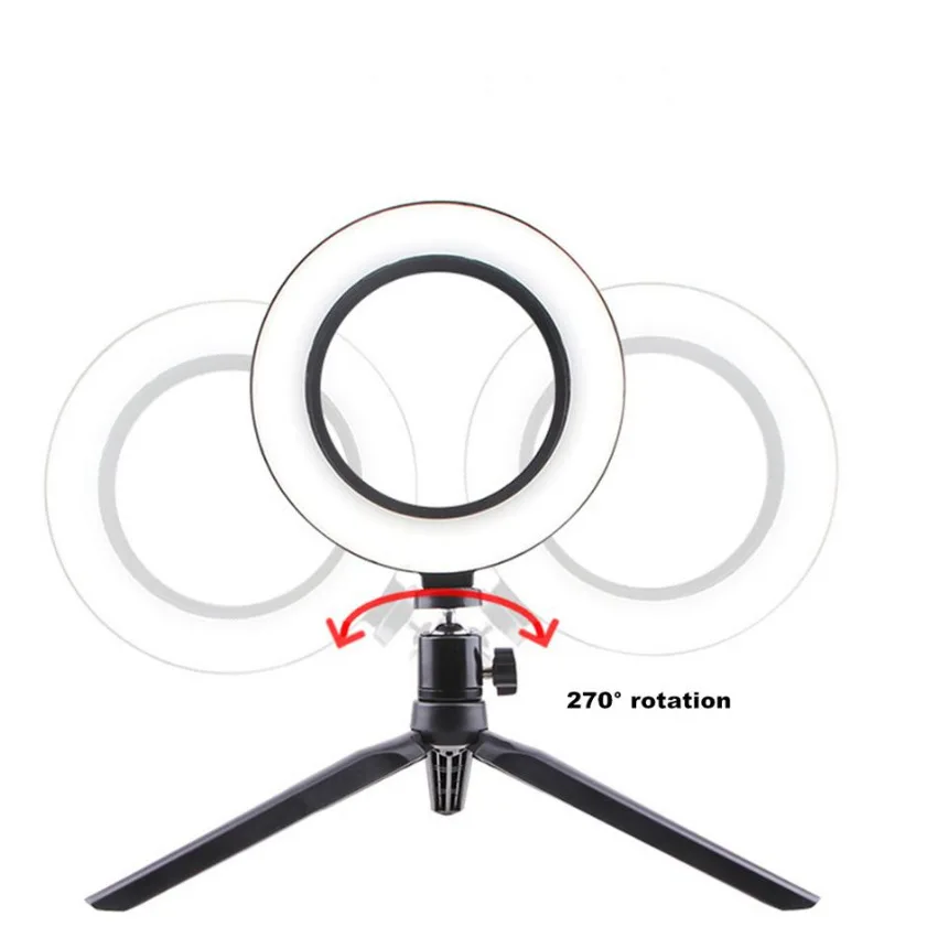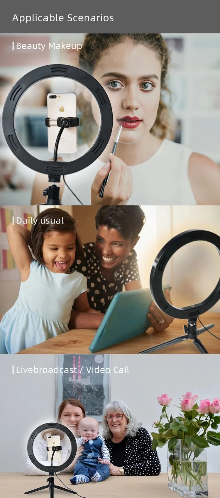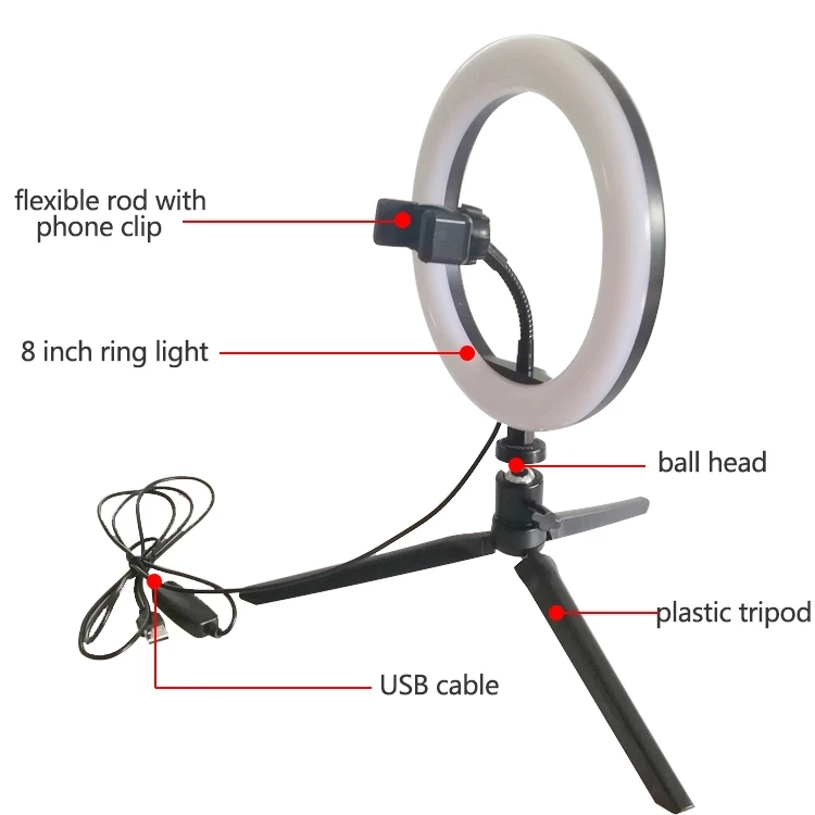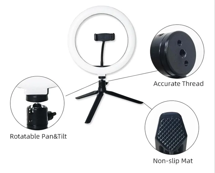 Package include: 1. 10inch ring light with USB button control 2. 360 Degree rotation ball head 3. 19cm tripod 4. Phone holder