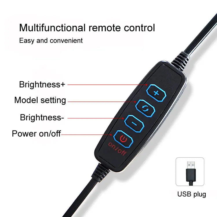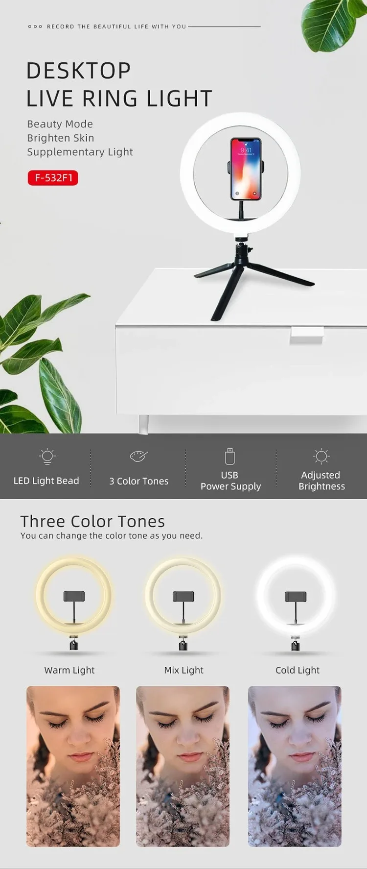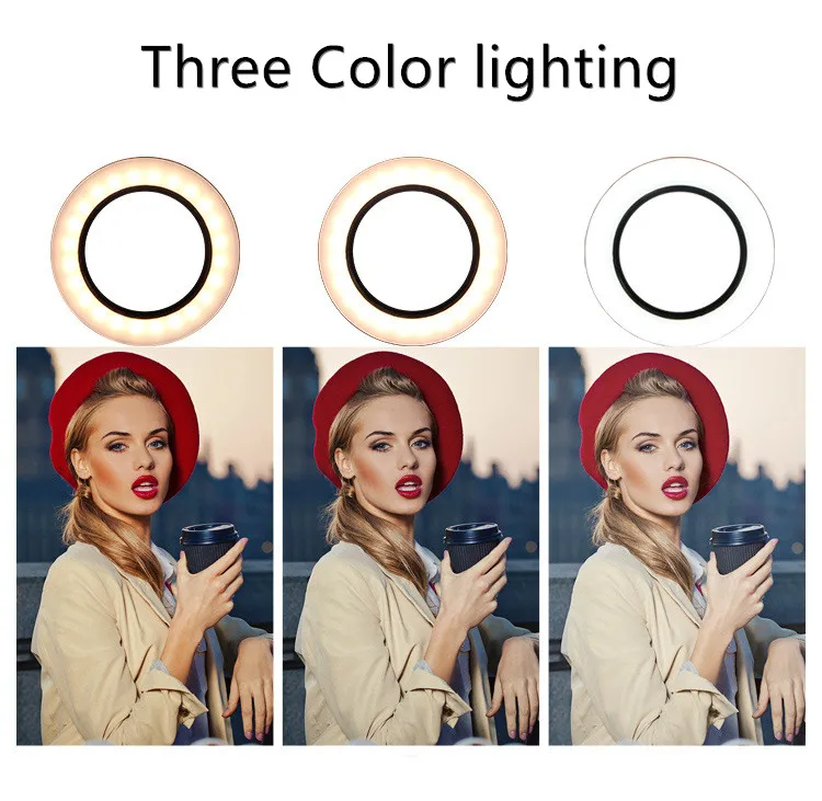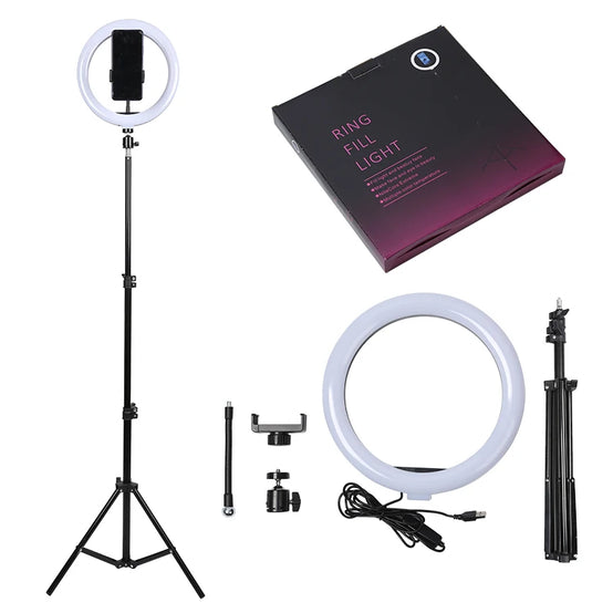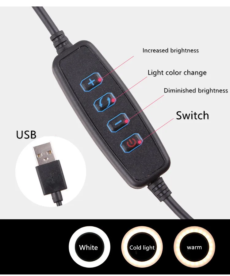 Package include: 1. 10inch ring light with USB button control 2. 360 Degree rotation ball head 3. 19cm tripod 4. Phone holder