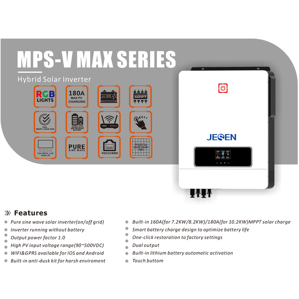 - Built-in 160A(for 7.2KW/8.2KW)/180A(for 10.2KW)MPPT solar charge