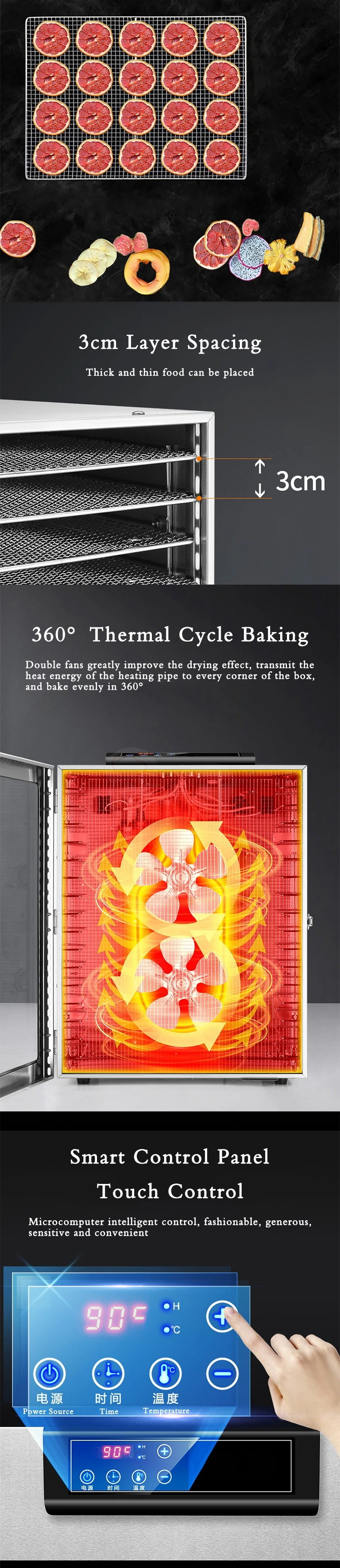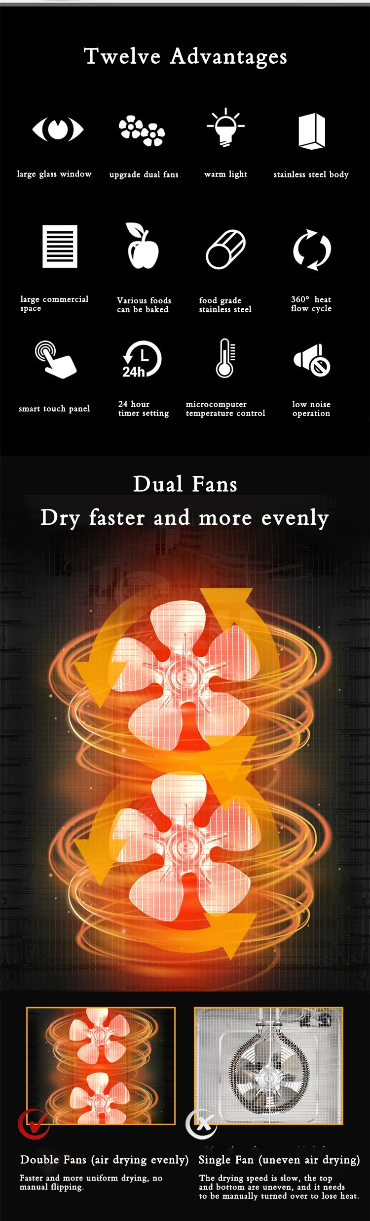 ● Intelligent automatic drying; ● Dual fans,dry faster and more evenly; ● Panoramic visual design,thickened tempered glass panel, you can check the drying effect in real time; ● Explosion-proof lighting,can clearly observe the changes of food even at night; ● Multiple layers optional,to meet commercial needs.