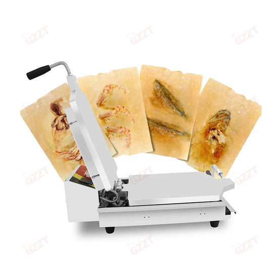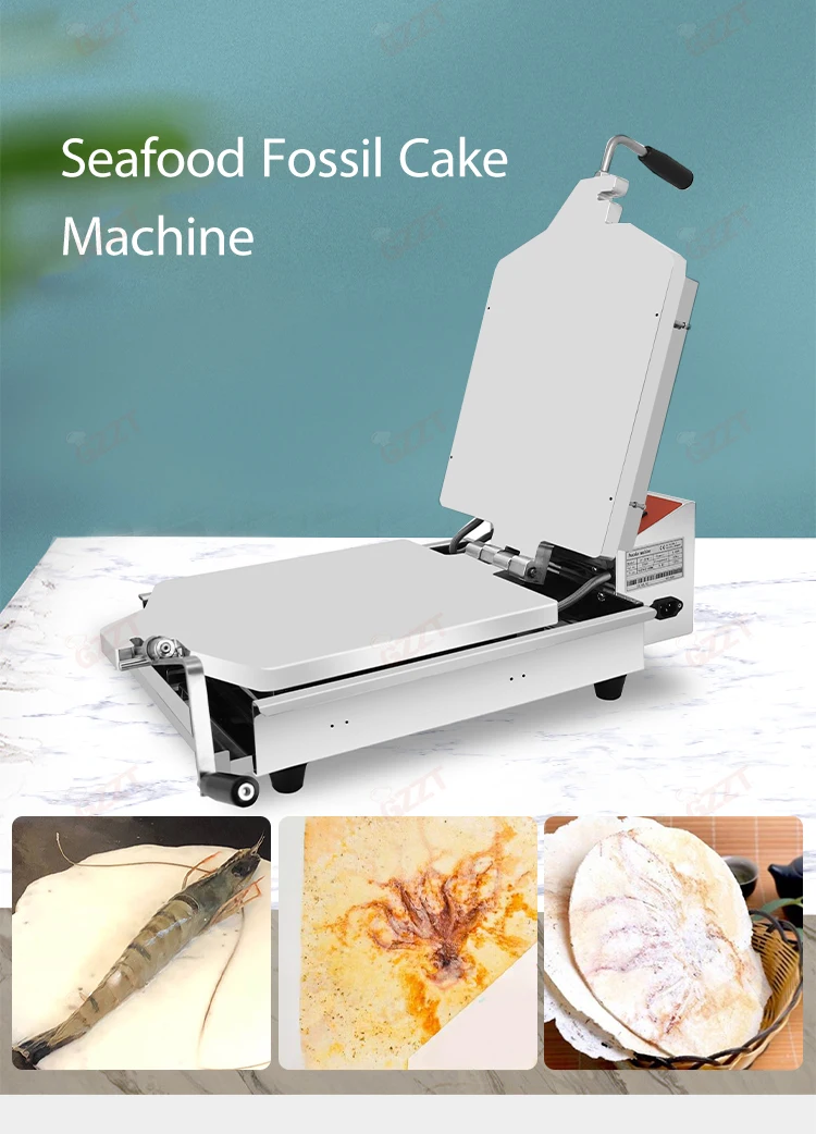 Introduction of Seafood Fossil Cake Machine ​ All kinds of fresh aquatic raw materials (such as fresh shrimp, squid, fish, jellyfish, etc.) are wrapped with special flour and directly put into the machine for processing without any additives. It only takes two or three minutes to make a thin, crispy, fresh, healthy and delicious seafood pancake. The shapes of various aquatic products are fully displayed on the pancake Seafood Fossil Cake Machine Features 1. Digital display control panel, temperature adjustable 2. The thickness of 2cm aluminum alloy baking pan, the surface is heated more evenly 3. 10mm U-shaped stainless steel tube, uniform heating and fast heating