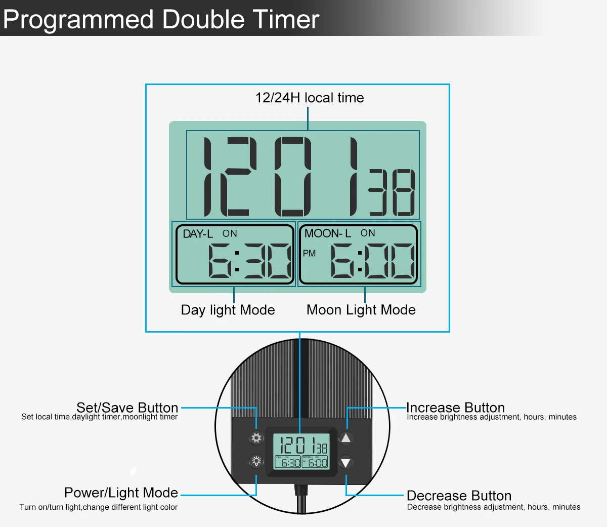 3. The LCD displays the local time on the same screen, with dual timers to control the lights during the day and night respectively.