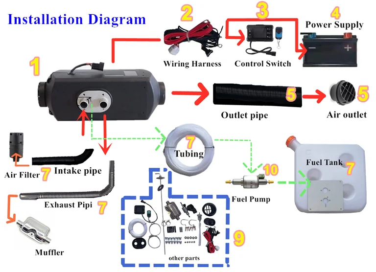 Diesel Parking Air Heater This is the most popular truck parking air heater on the market. The parking heater is an on-board heating device independent of the car engine It has its own fuel pipeline, circuit, combustion heating device, and control device. Without starting the engine, the car engine and the cab parked in the low temperature and cold environment in winter can be warmed up. Completely eliminate the cold start wear of the car. The model of this diesel parking air heaters is divided into two types - D2(2KW) and D4(5KW), 12V and 24V both available, very easy to install.