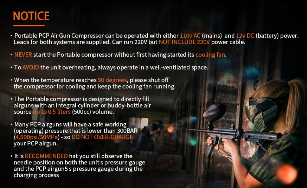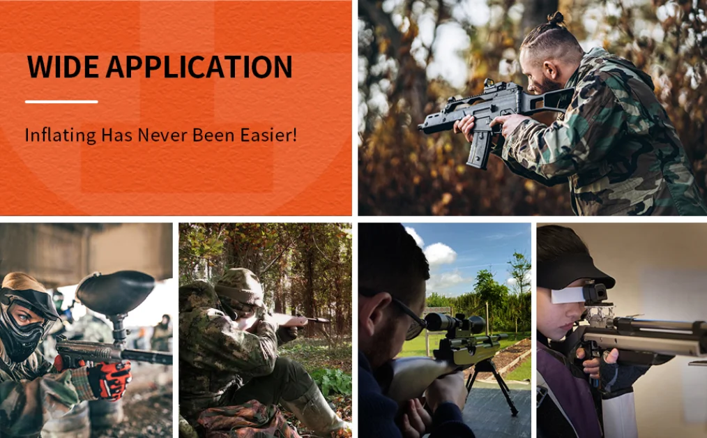 👍 The portable PCP compressor can be directly powered by a 12V car battery outdoors or a 110V/220V socket at home