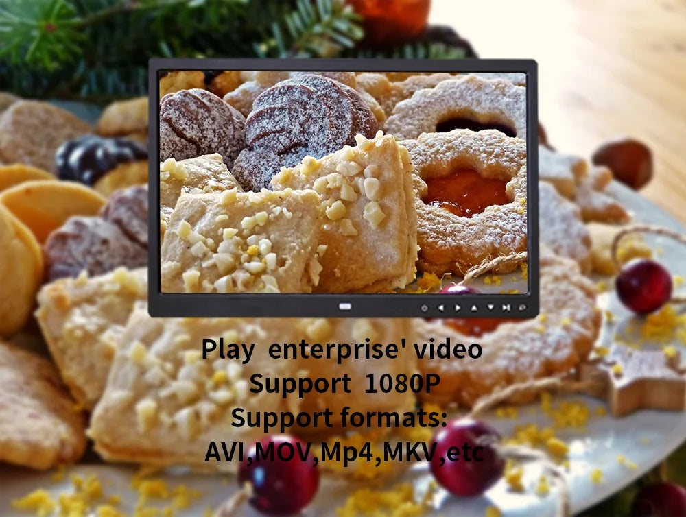 Technical solution: Allwinner Technology Aspect Ratio: 16:9 Display area: 330*205mm Support video format: MKV、MOV、M4V、MPG、AVI、VOB、MP4、3GP... Support audio format: MP3 Images supported formats: JPG、JPEG(Baseline coding) Playing multimedia: Single looping pictures or video or music,Can also be mixed seeding (make a continuous loop for images and video)