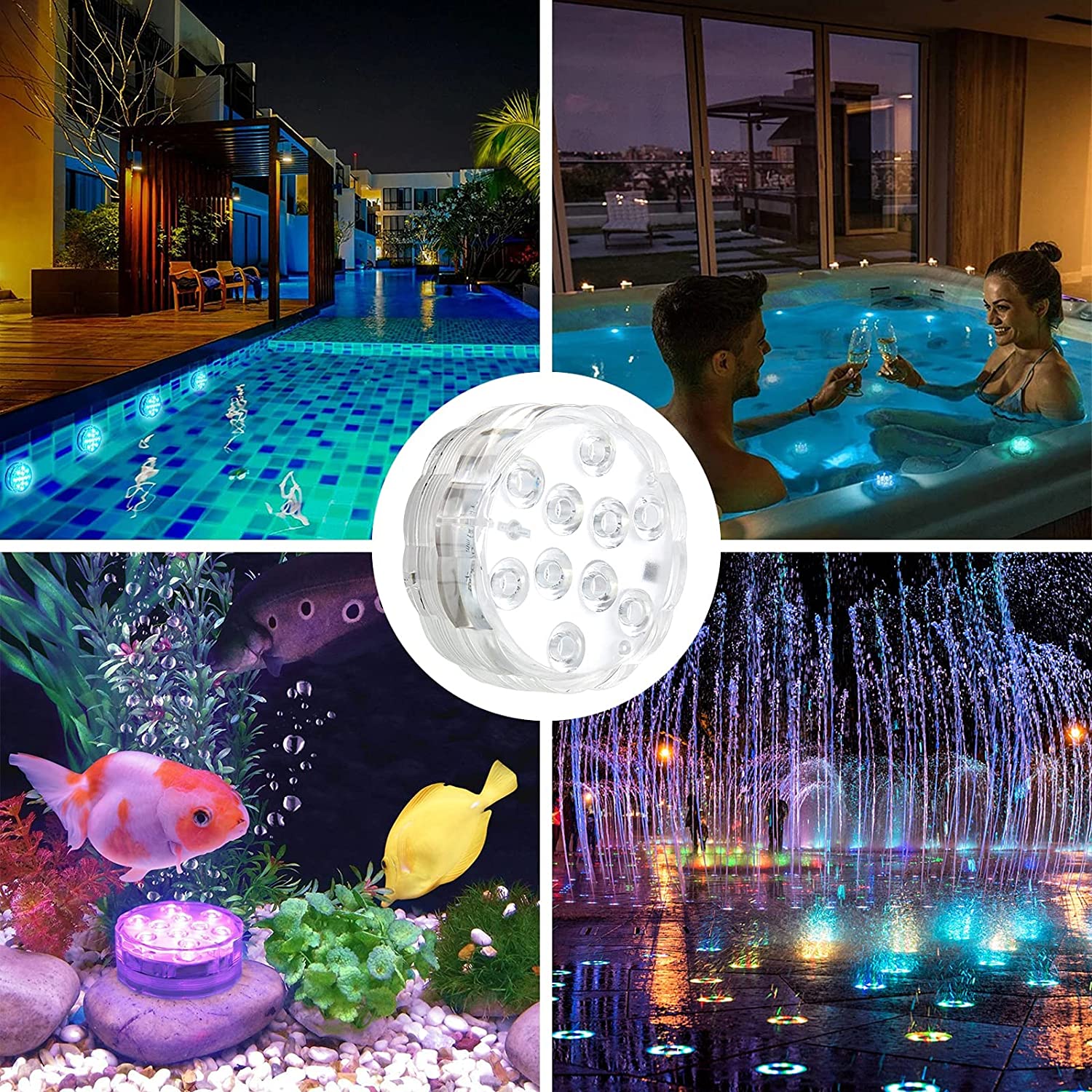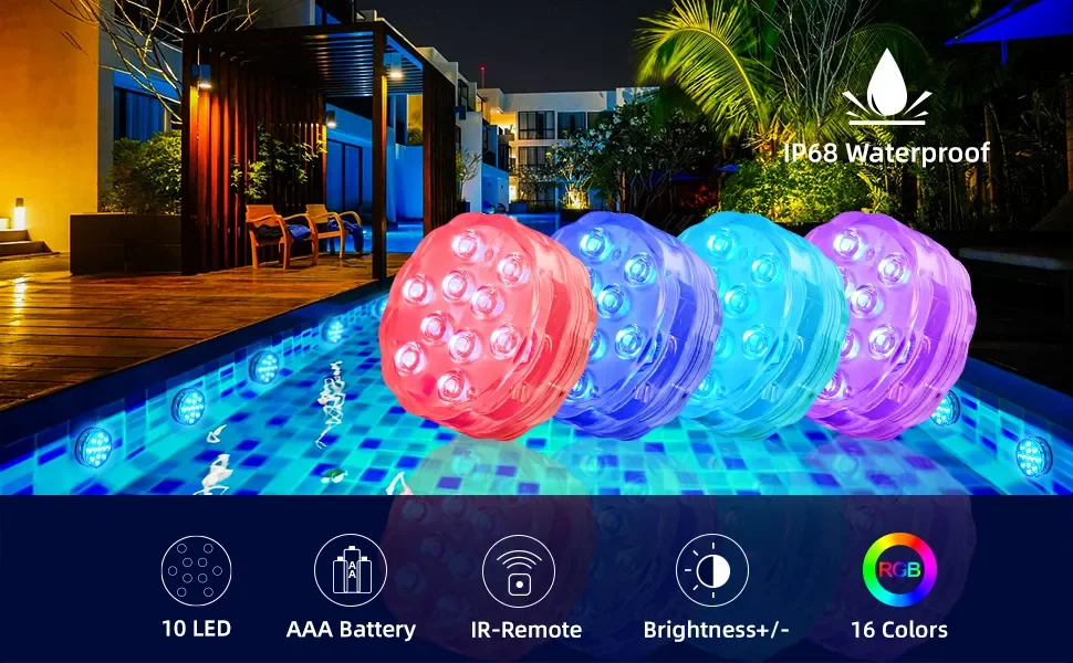 This multicolor pool light is a multicolor color-changing dive light with 3 battery slots inside the light. This submersible LED light is suitable for many scenes, it can be used as a pool decoration, placed at the bottom of a vase, placed in an aquarium, or placed in a bathtub as a toy. This dive light contains 10 LED lights inside with 16 colors and 4 flashing modes. This submersible LED light comes with a 24-button remote. It can be controlled remotely through the controller. The remote control allows you to make one-touch color display selections. This underwater light offers energy efficiency and a safer 4.5-volt connection.