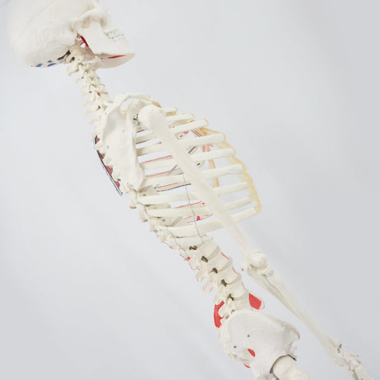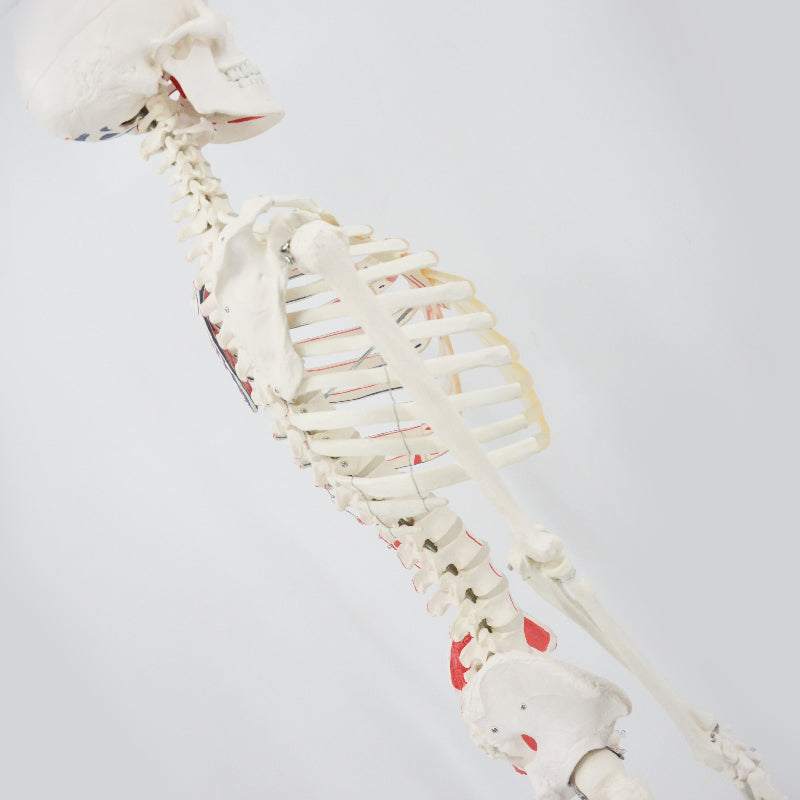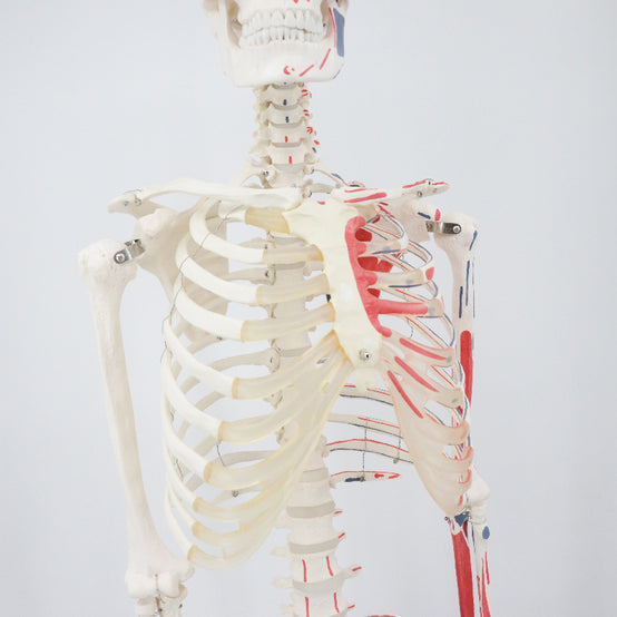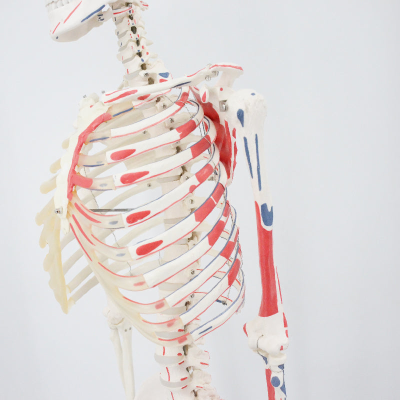 provide intricate details and long-lasting are articulated; the upper and lower limbs following parts are detachable: Calvarium, Jaw, Legs, Skull, Arms.The left side of the skeleton shows the points of origin (red) and the points of insertion (blue) of the muscles.