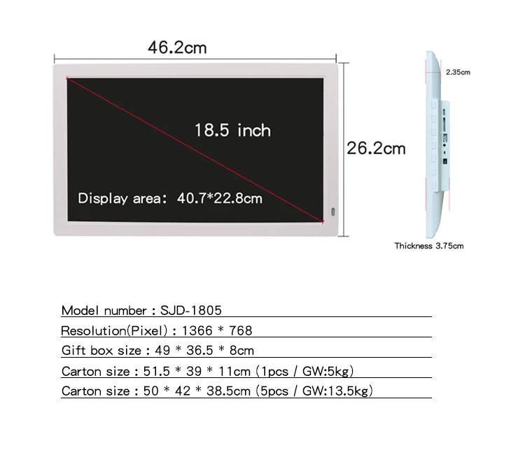 18.5 inch Digital Photo Frame with Motion Sensor 19 inch Advertising Player loop videos pictures via USB/SD card