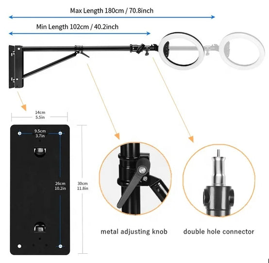 The wall mounting flexible arm is made of high quality aluminum with 1/4 and 3/8 screw perfect for supporting ring light, monolight, flash light, DSLR camera etc. It is easy to be fixed on a solid wall and ceiling to save space, make your beauty salon studio space feel more larger and clutter-free.