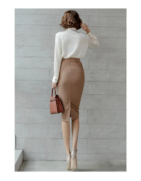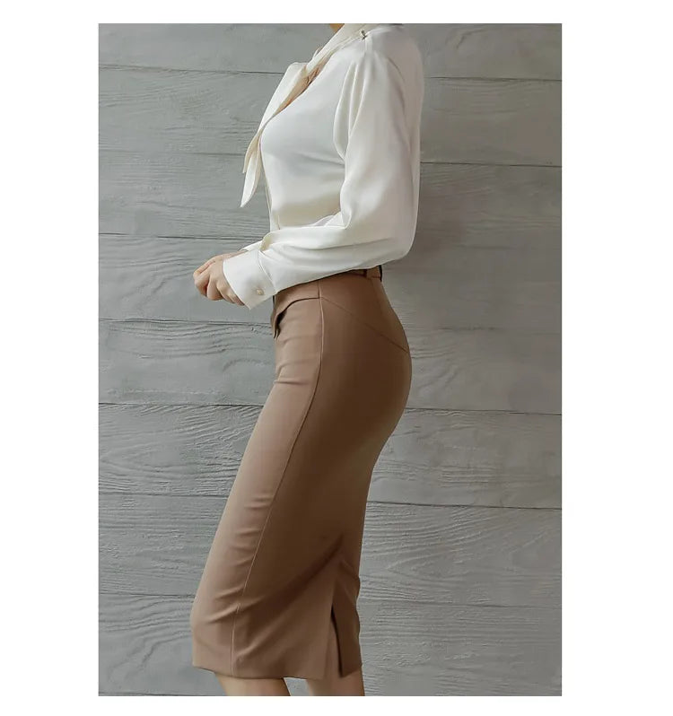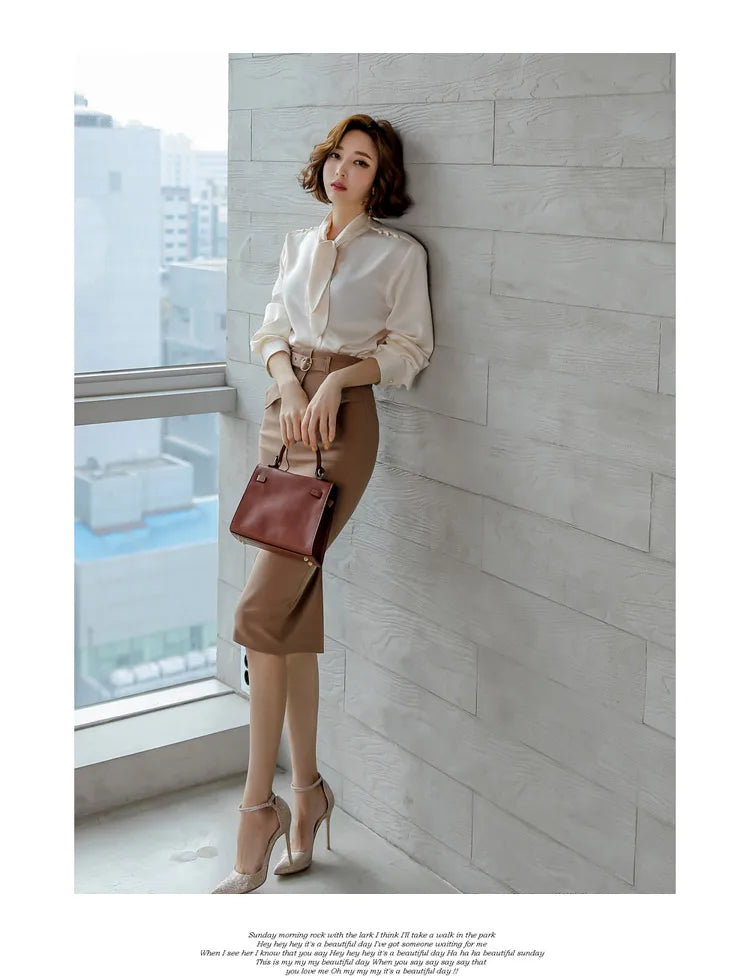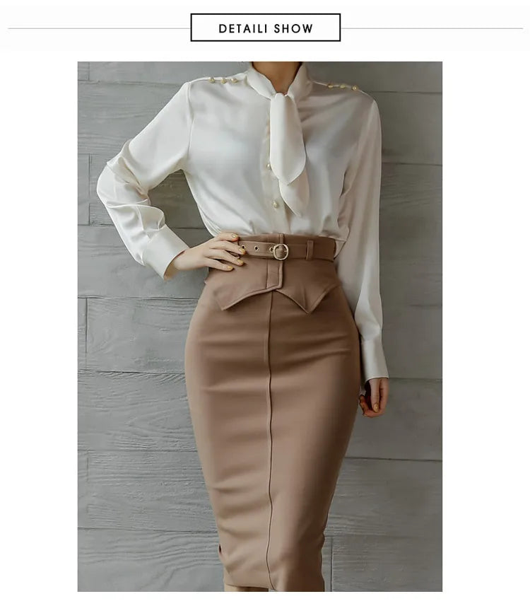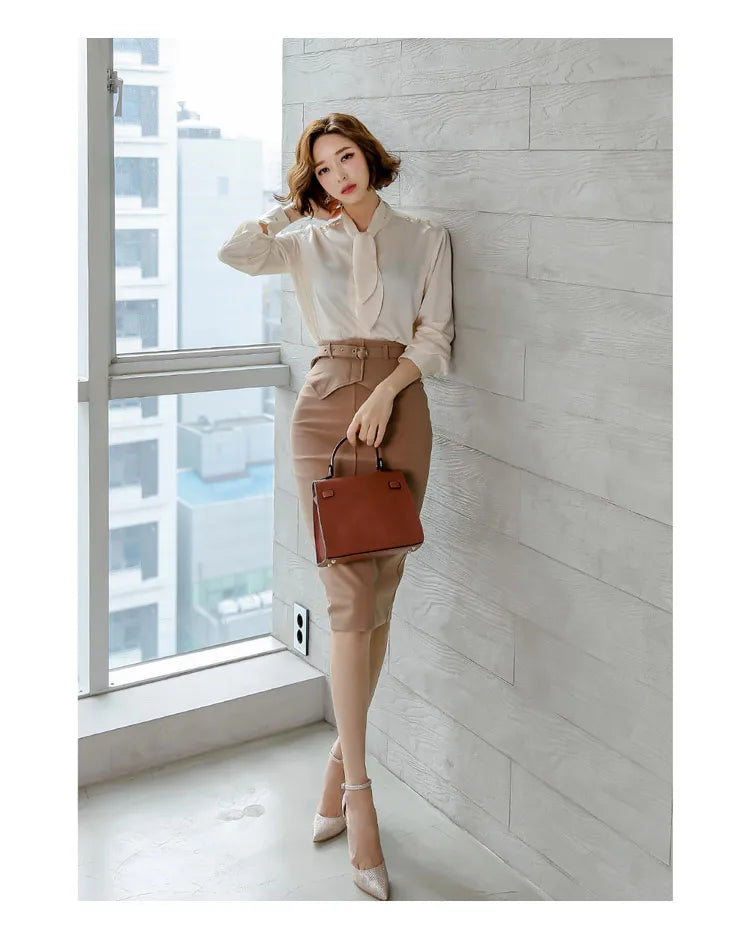 2020 New Fashion 2 pieces korean office dresses bow decoration shirt with straight bodycon skirt formal dresses