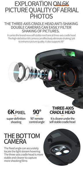 GPS smart flight/4K High definition camera/Electrical control camera/ 90° angular regulation/50 times zoom/Light stream positioning/ GPS positioning/Gesture photo/Surrounding flight/Automatic following/ 3 axis mechanical cradle head/5G Wi-Fi /Brush-less motor/Smart modular battery; |