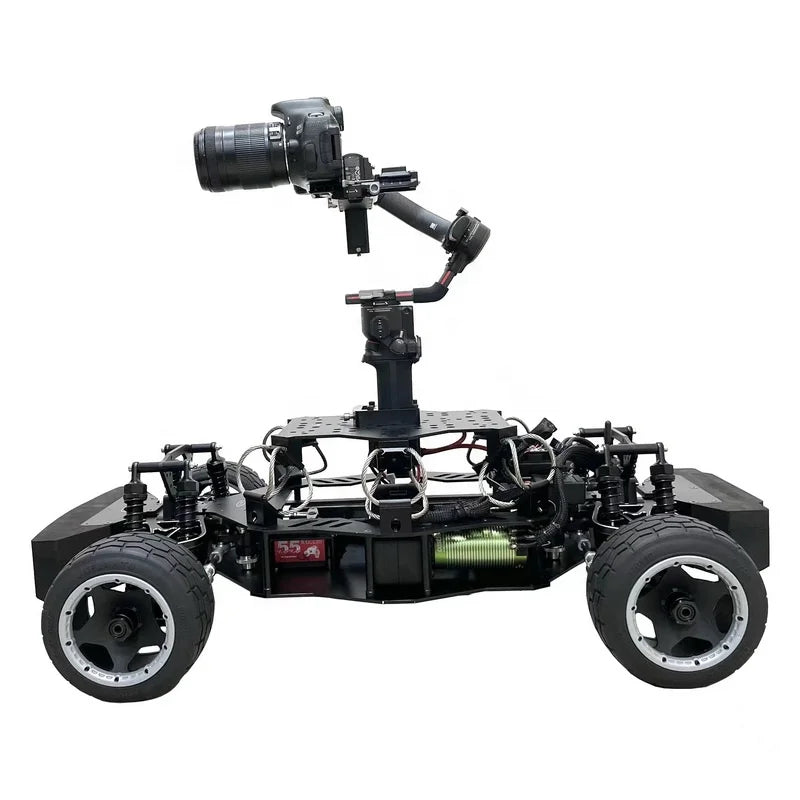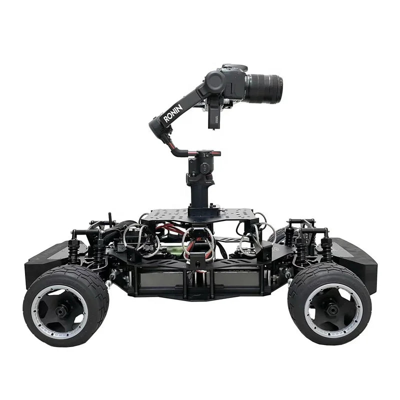 Features: - 4.0mm 6061 T6 aluminum alloy chassis - 4WD Version, four-wheel steering with easy handling and running smoothly, steering is very flexible, high level metal frame. - Maximum speed: 70km / h - Maximum load: 30kg. Low angle, sports and shooting, compatible with DJI RONIN 2,RONIN RS2, Shotover, Freefly brand three-axis stabilizer and professional Cine Camera. - 200A brushless ESC - 800KV brushless motor - Battery: 2 * 14.8V, 40C, 5200MAH Lipo batteries - Full metal independent suspension hydraulic shock absorption system, steel wire damping + professional rubber damping ball triple damping system - 2.4G Futaba 4PM controller - Tire:on-road, optional all-terrain, ice tires, big foot tires, track wheels. - Damping system: the middle is steel damping to ensure picture stability when starting and stopping time. Hydraulic shock absorber. Independent system parts are not deformed steel wire, shock resistance vibration absorption equilibrium With light, solid alloy fittings, even if the road bumps, but also to maintain steady