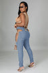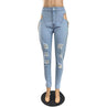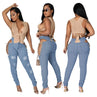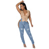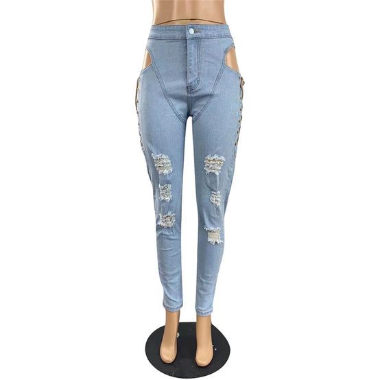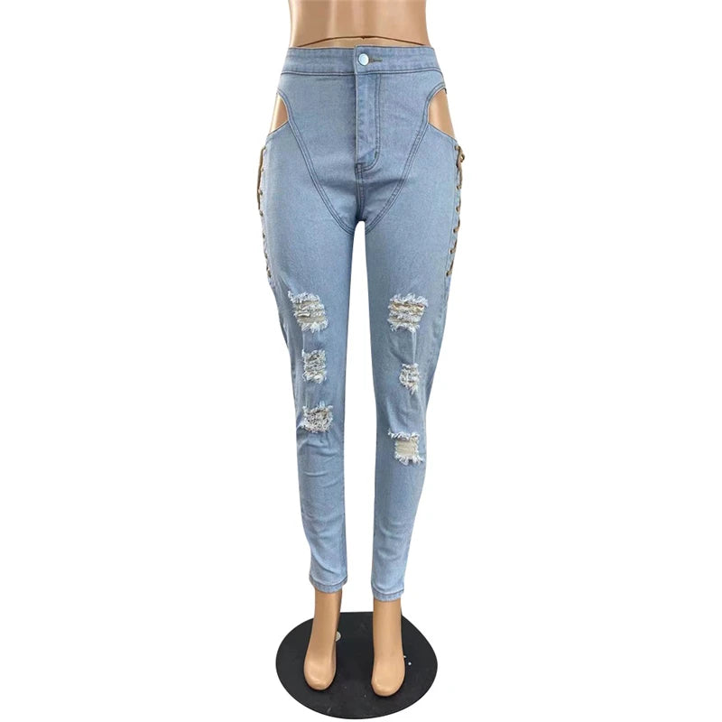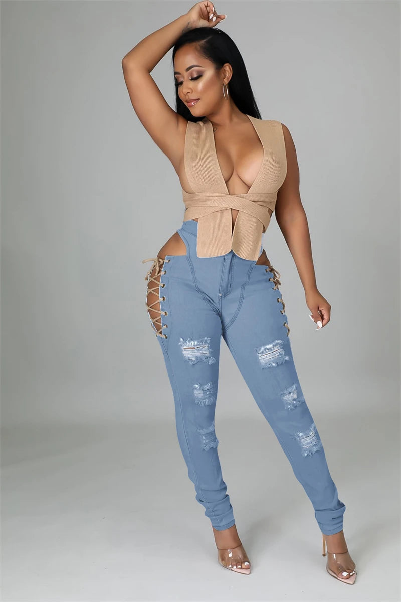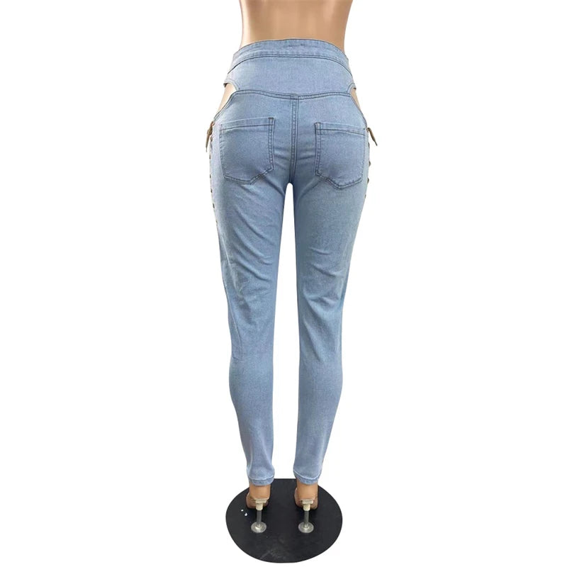 2022 spring and summer ladies hollow out bandage custom light blue women jeans high waist woman denim pencil pants for women