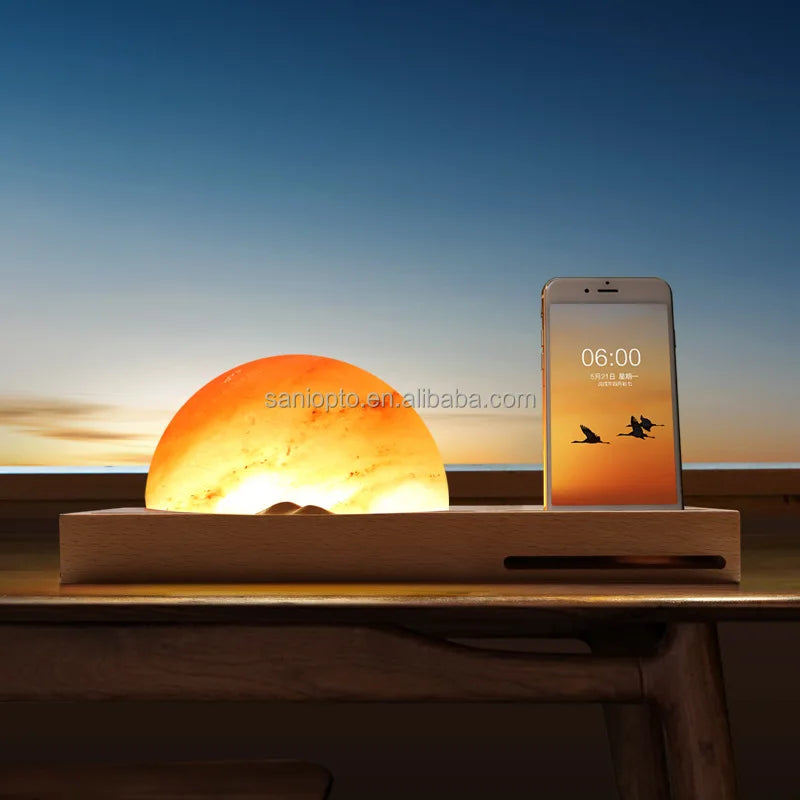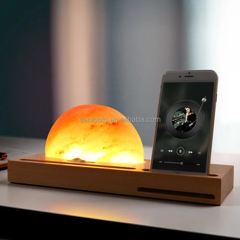 2023 Best Selling product Modern creative customizing wood base Speaker Himalayan Salt Lamp with Wireless Charger Sunrise Lamp