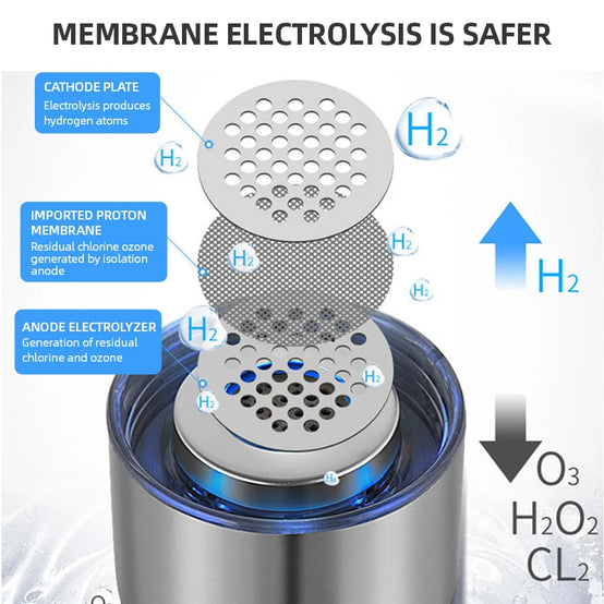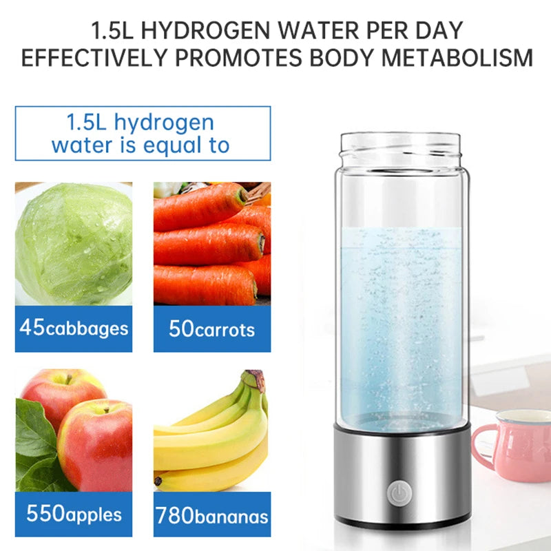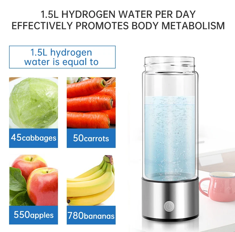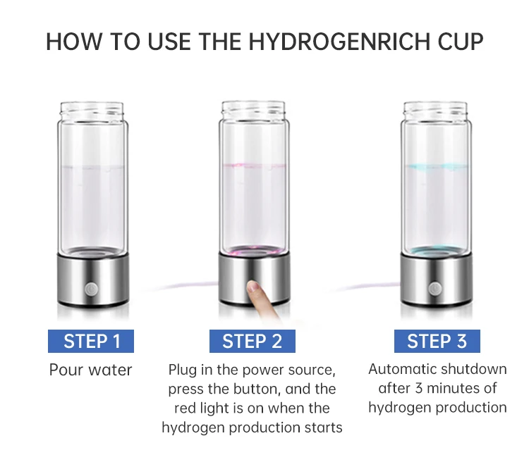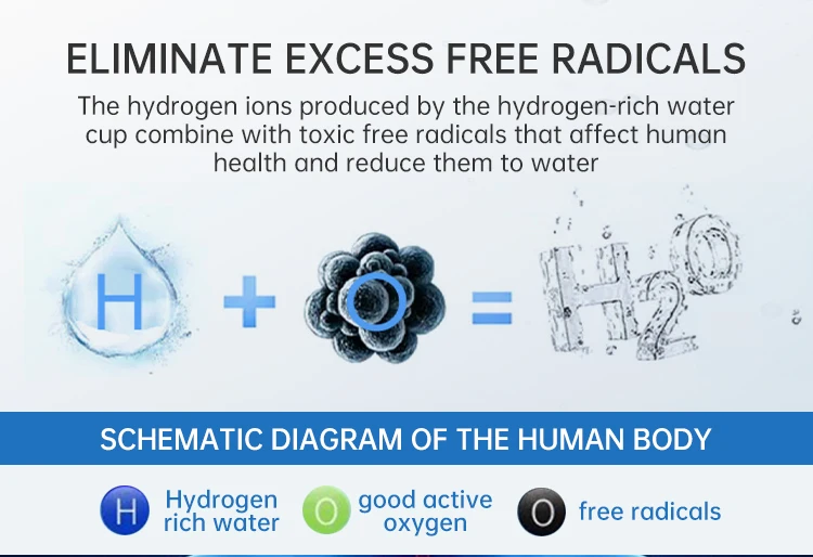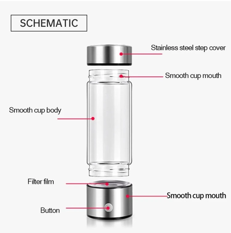 1. Rapid electrolysis: This hydrogen water cup is equipped with an electric electrolysis device, which can quickly generate and dissolve hydrogen gas in water. In just a few minutes, you can enjoy fresh, hydrogen rich water, allowing you to maintain healthy drinking habits anytime, anywhere. 2. Innovative SPE technology: This hydrogen water cup adopts a new type of SPE (solid polymer electrolyte) technology, ensuring efficient generation and stable dissolution of hydrogen gas. SPE technology not only efficiently electrolyzes water, but also eliminates harmful substances and impurities, providing you with pure hydrogen water, ensuring that you enjoy the highest quality healthy drinking water. 3. Healthy drinking water: Hydrogen is rich in powerful antioxidant capacity, which can help neutralize free radicals, reduce oxidative damage in the body, help resist diseases, and enhance immunity. Drinking water rich in hydrogen every day can help you maintain your health and vitality. 4. Portable design: This hydrogen water cup is small and lightweight, easy to carry, allowing you to enjoy healthy hydrogen water anytime, anywhere. Whether in the office, gym, or during travel, you can easily use this hydrogen water cup to maintain healthy drinking habits.
