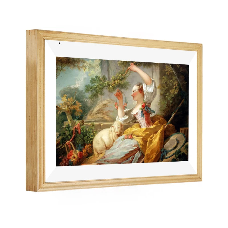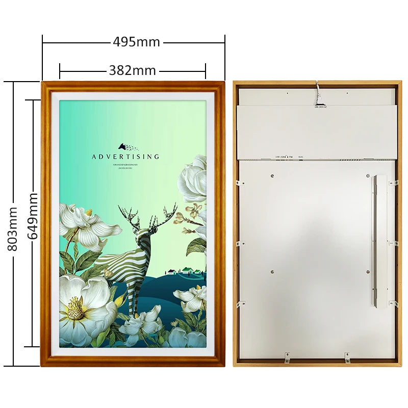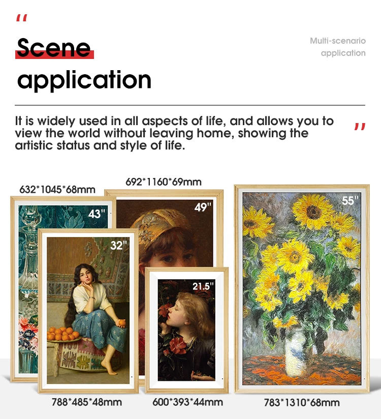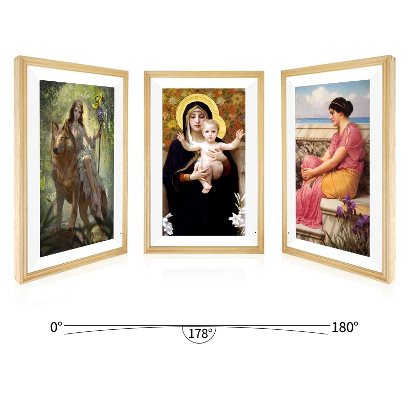 Usingwin frame screen uses BOE silicon sanding surface liquid crystal for oil painting display, good astigmatism, anti-glare,strong anti-light interference (also visible in scenes with strong light), backlight with color temperature and color gamut suitable for oil painting display, with excellent Core micro-specific screen display adjustment software, in the case of extremely low power consumption (for half of the traditional specifications of the same power consumption), the screen display is delicate and bright, there are canvas bump effect, no reflection, no glare, no long-term eye fatigue.