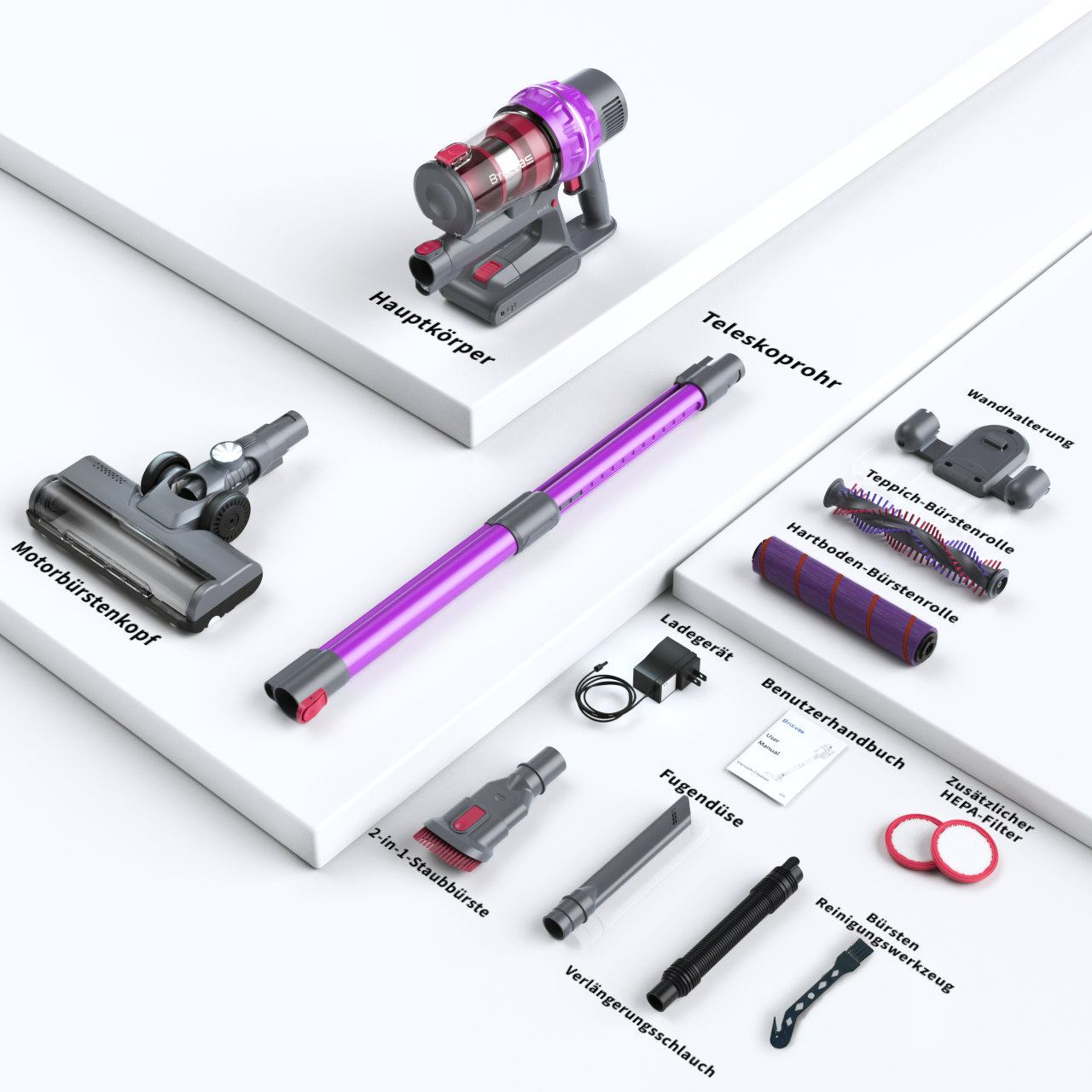 Detachable battery, extension tube, with LED headlight, extra soft roller brush, two piece HEPA filter, hose.