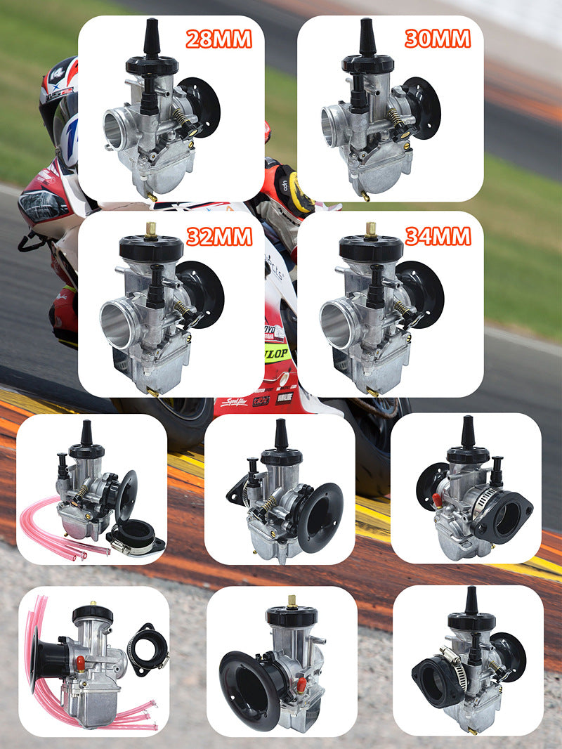 Intake size:28MM Main jet :118 Pilot jet : 38 Intake size:30MM Main jet :125 Pilot jet : 38 Intake size:32MM Main jet :130 Pilot jet : 38 Intake size:34MM Main jet :135 Pilot jet : 38 Fit for:125CC~300CC Yamaha Honda Suzuki Kawasaki Dirt Bike , Scooter , ATV and Racing motorcycle 100% Brand New Carb A-CLASS Quality This carburetor with A-Class quality hight performance and used for motorcycle modification racing or repair and can improve the performance and power of your motorcycle