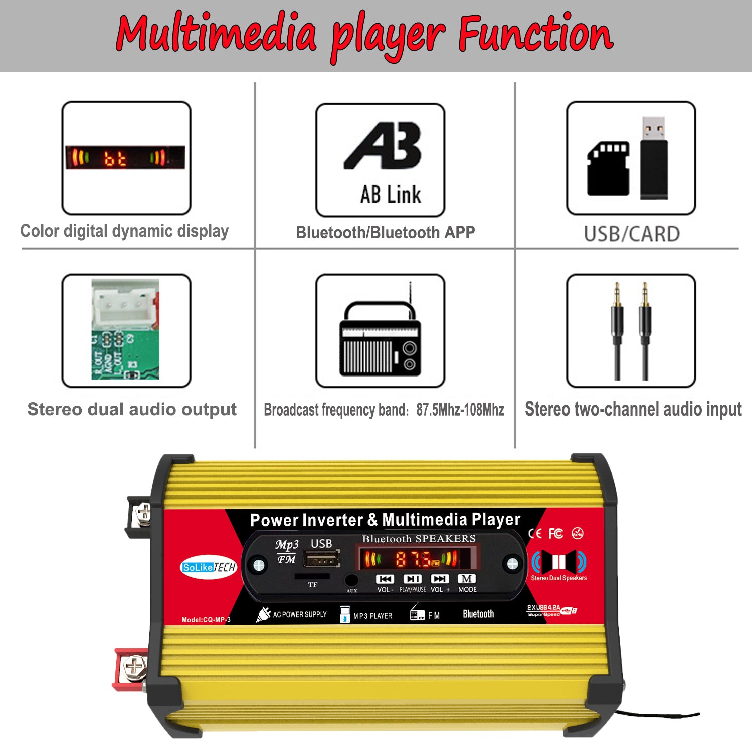 300W Car Power Inverter DC 12V to AC 110V/220V Multimedia Player Converter Inverter 2.4A 2-Port USB with MP3 and AC Outlets