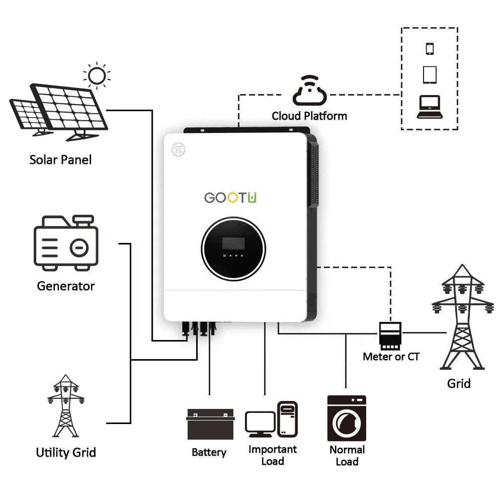 GOOTU dual output solar inverter is a type of solar inverter that has two separate AC outputs. This allows for the inverter to be used in a variety of different applications, such as powering two separate buildings or powering a home and a backup generator simultaneously. The dual output feature also allows for greater flexibility in system design, as it can be used to optimize energy production and distribution. Dual output solar inverters are commonly used in larger residential and commercial solar installations.