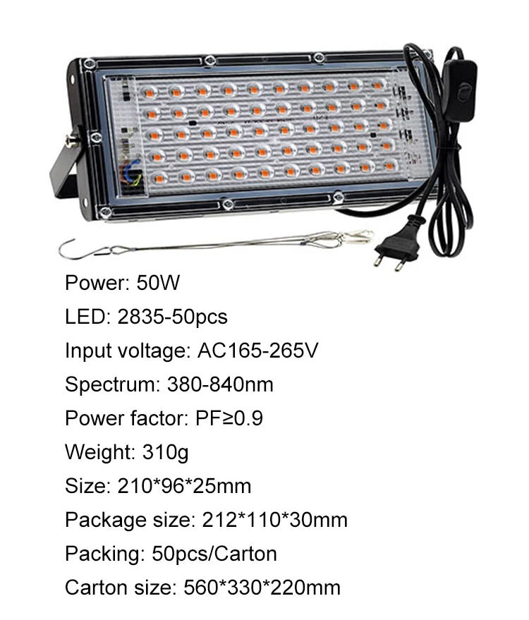 Power: 50W Light source: SMD2835-50PCS Luminous efficiency: 100LM/W Color temperature: full spectrum 380-840nm Protection level IP Rating: IP65 Illumination angle View Angle: 120 ° Power Factor: ≥ 0.9 Warranty: 1 years