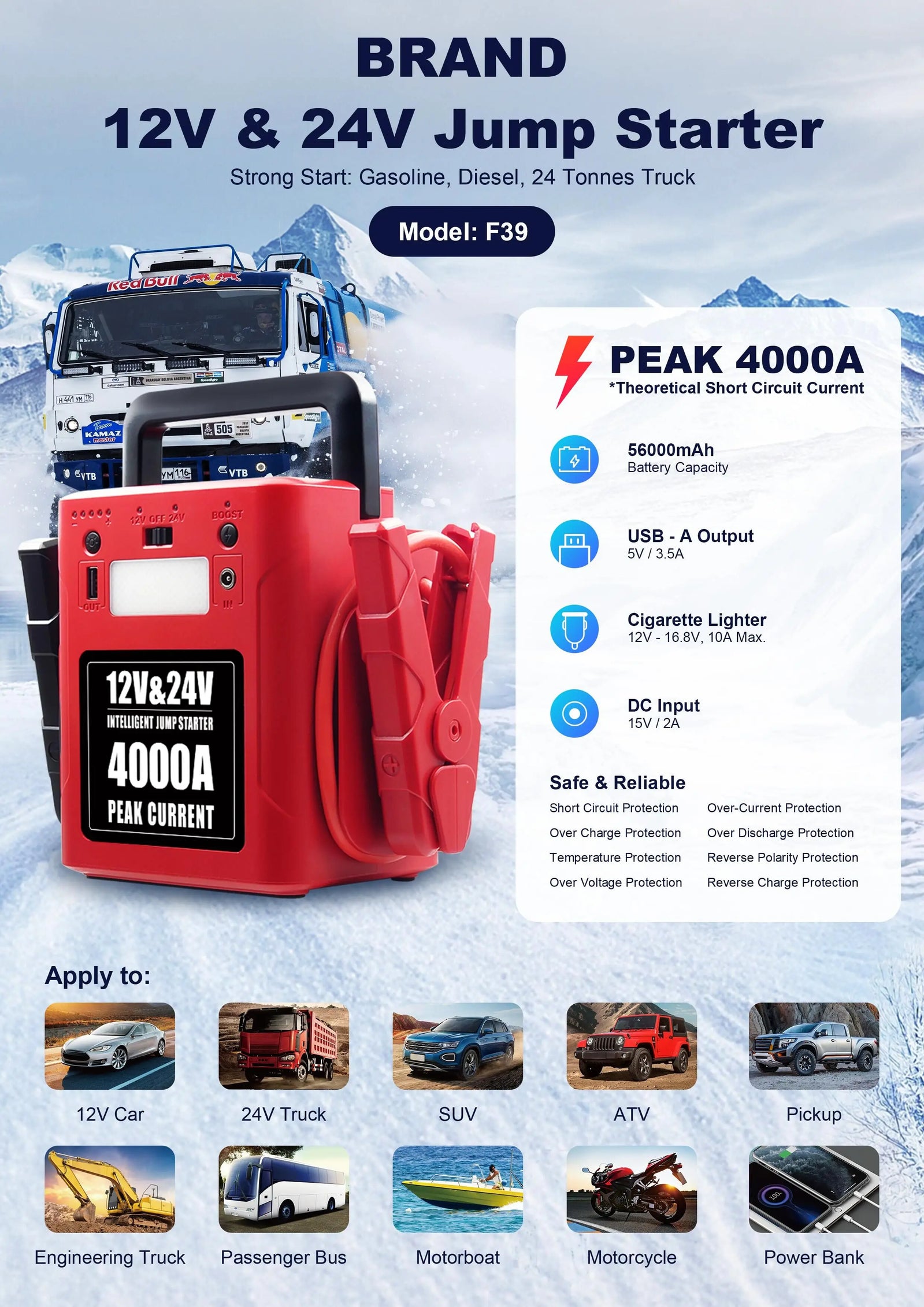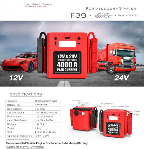 56000mAh JumpsPower 12V & 24V jump starter for semi truck 4000A