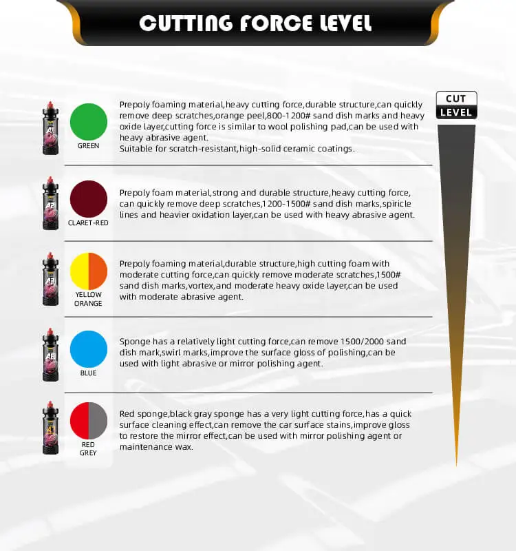 2. Yellow color 50 PPI foam material apply with cutting or polish compound for medium cut process, easy to remove the light scratch, swirls