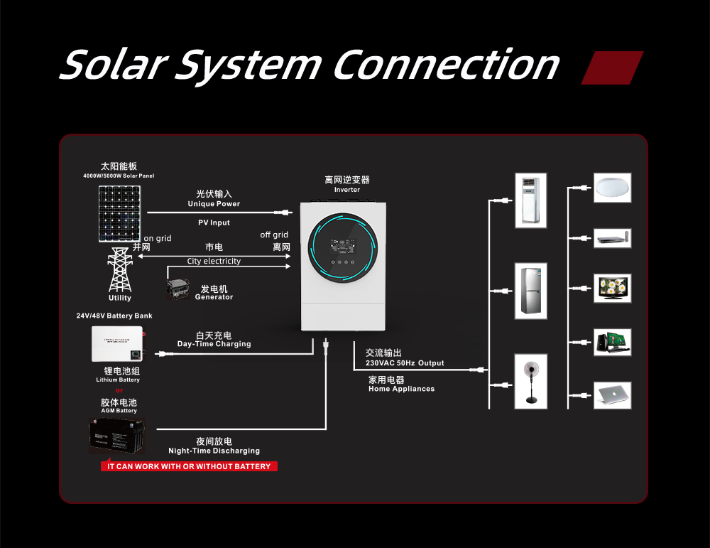 7. On grid and off grid solar inverter, support self-consumption and feed into the grid.
