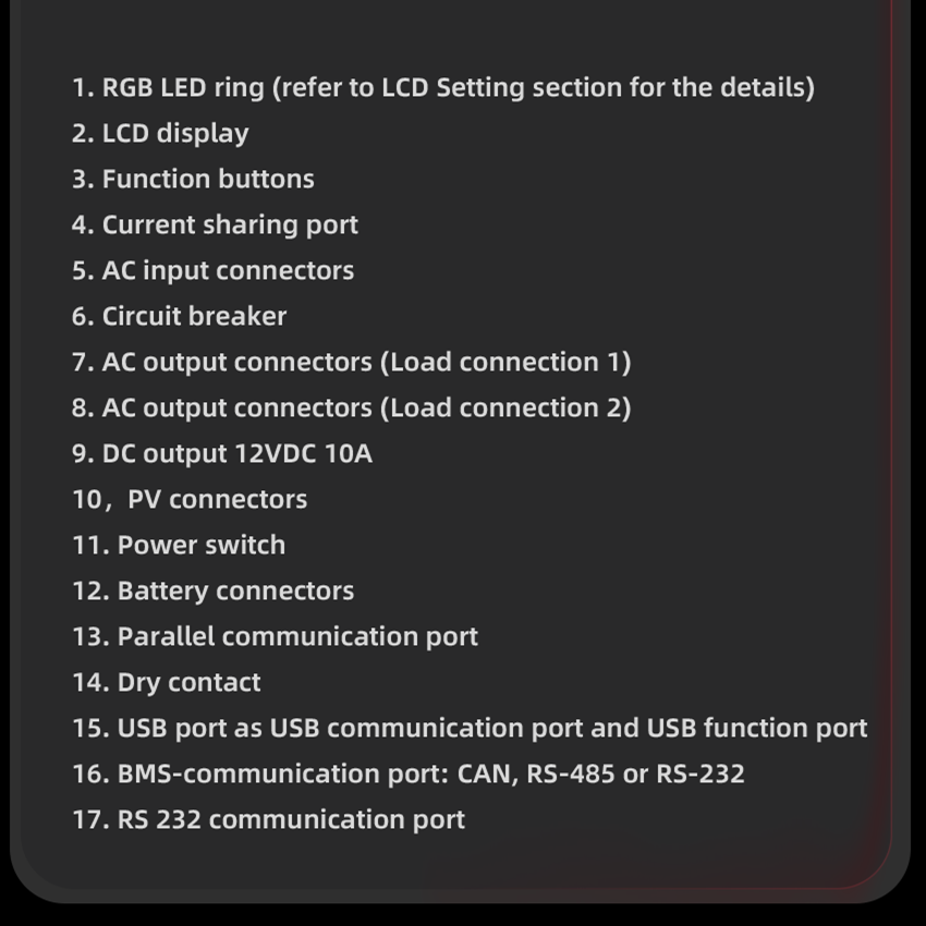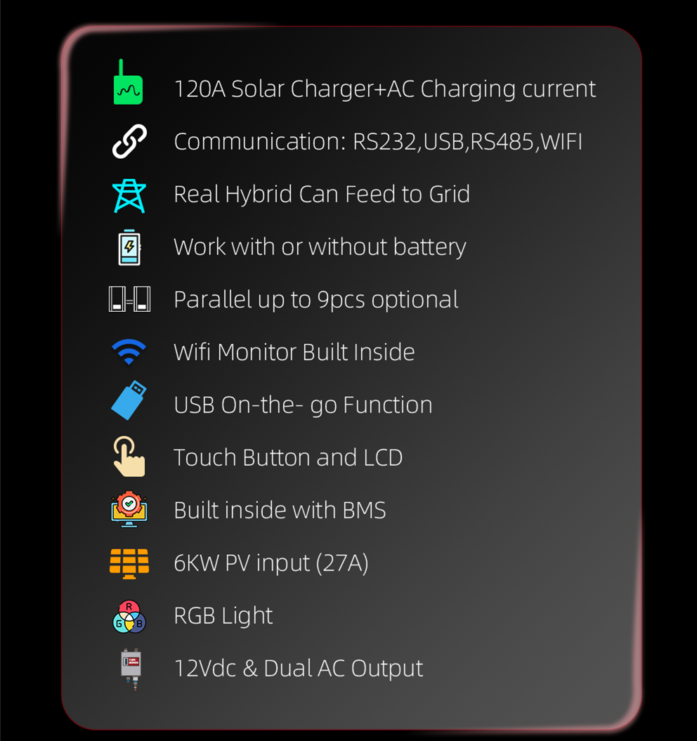 1. 120A MPPT solar charger inside, max pv input 6kw+ (27A )