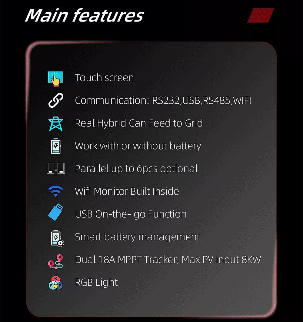 1. 120A MPPT solar charger inside, max pv input 8kw+ (2/18A )