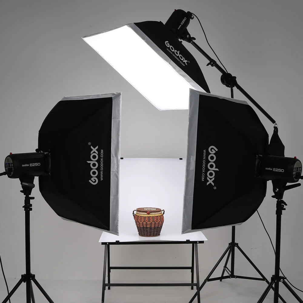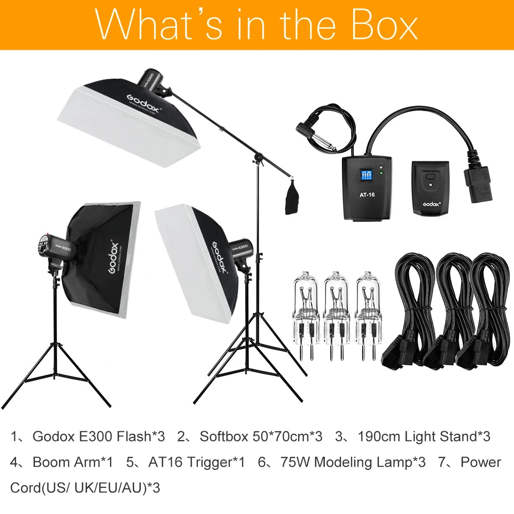 900Ws Godox 3x E300 Strobe Studio Flash Light Kit 900W - Photographic Lighting - Strobes+Light Stands+Triggers+Soft Box+Boom Arm