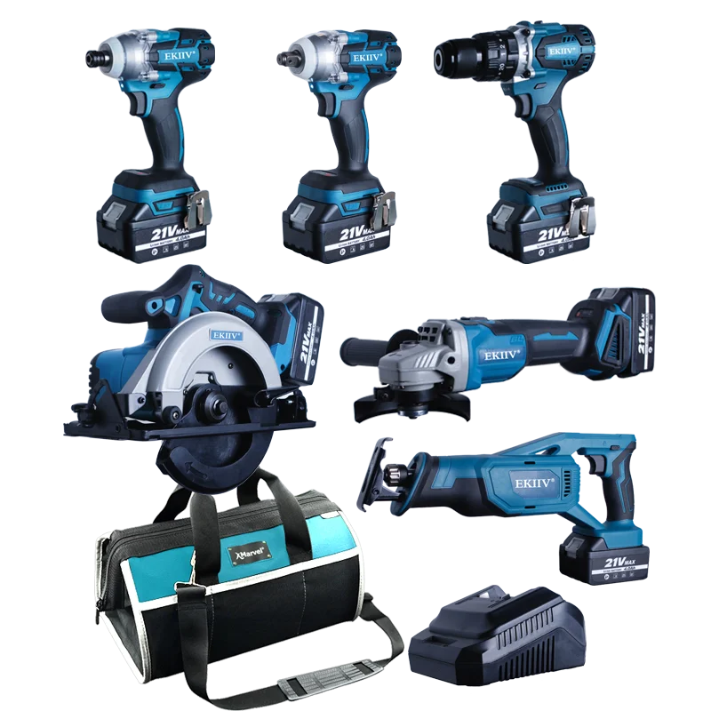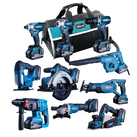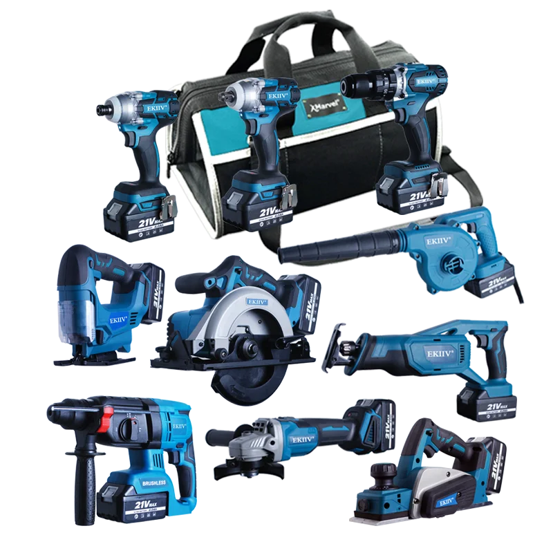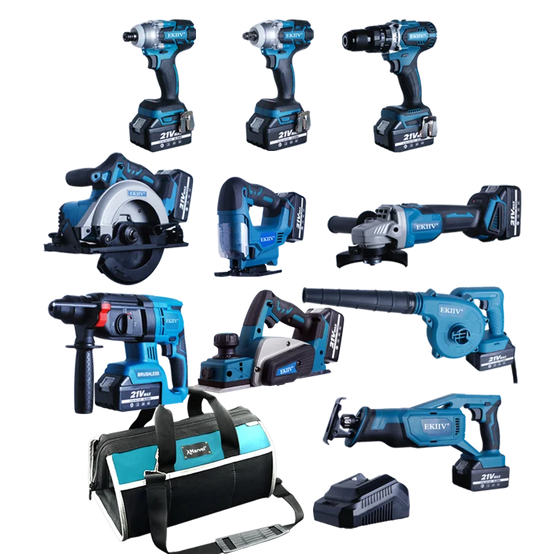 | CK2109 | Cordless brushless impact drill + Cordless brushless impact screwdriver +Cordless brushless impact wrecnch+Cordless brushless angle grinder+Cordless circular saw +Cordless reciprocating saw+Cordless blower+Cordless brushless rotary hammer +Cordless jig saw+ 4*4.0 Abattery + 3*2.0A Fast charger +2*18 inch bag |