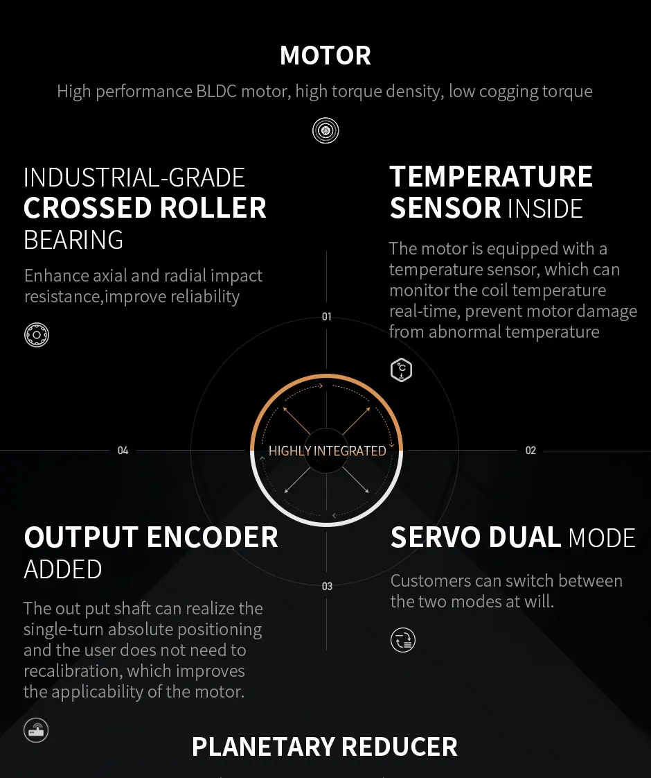 2, Strong Powerful Highly integrated Cross roller bearing Temperature and position sensor Low-consumption copper coil.