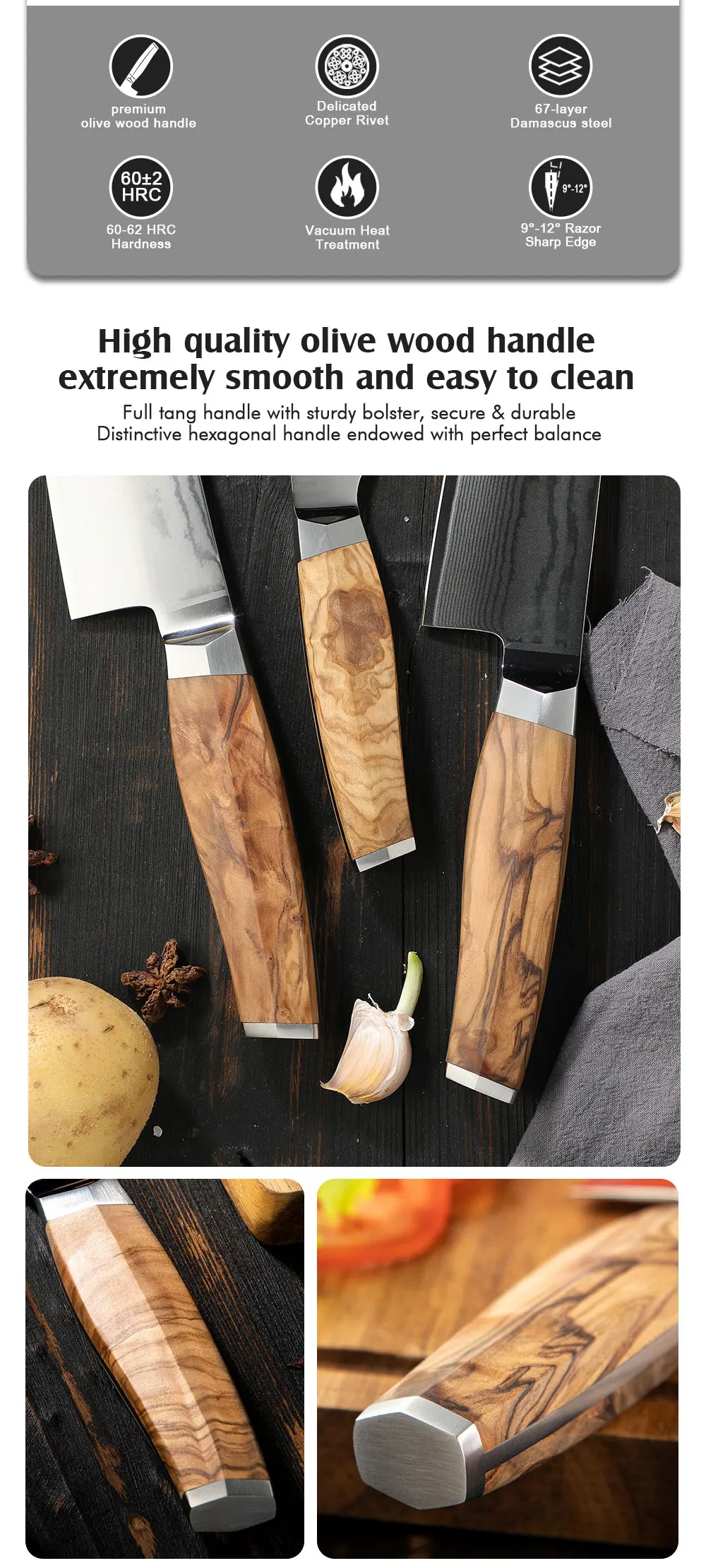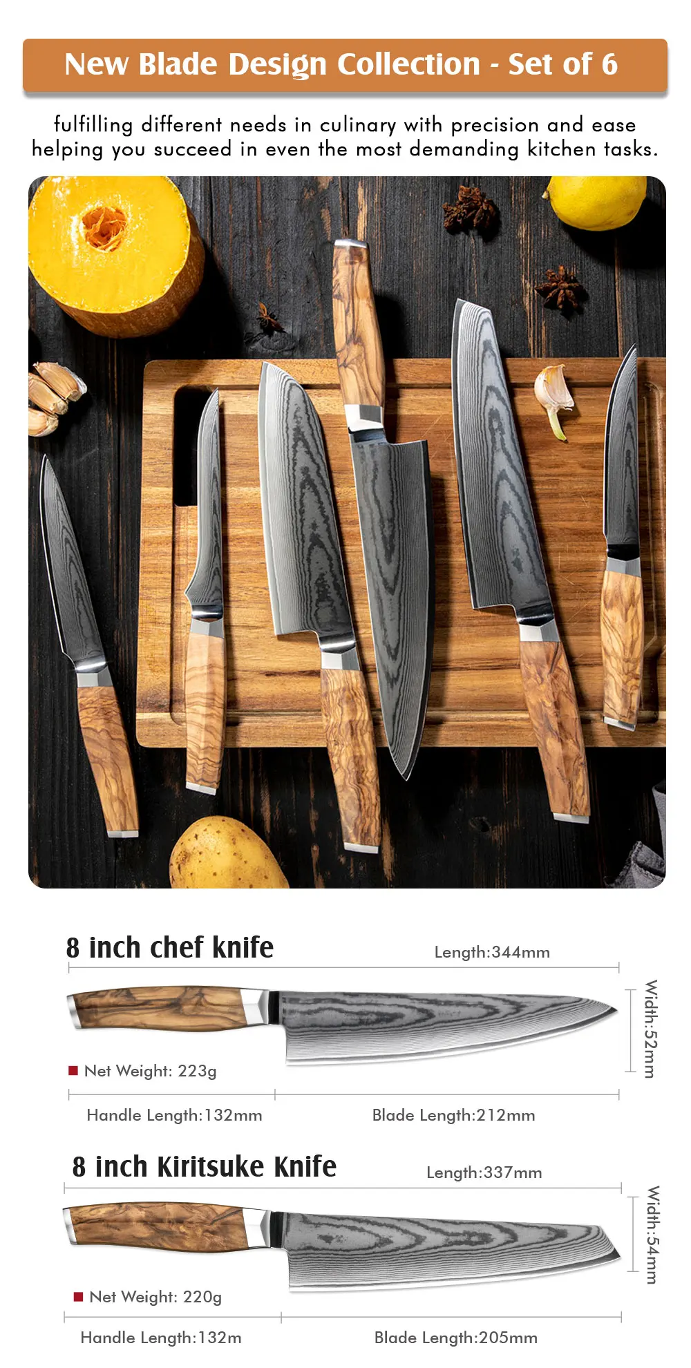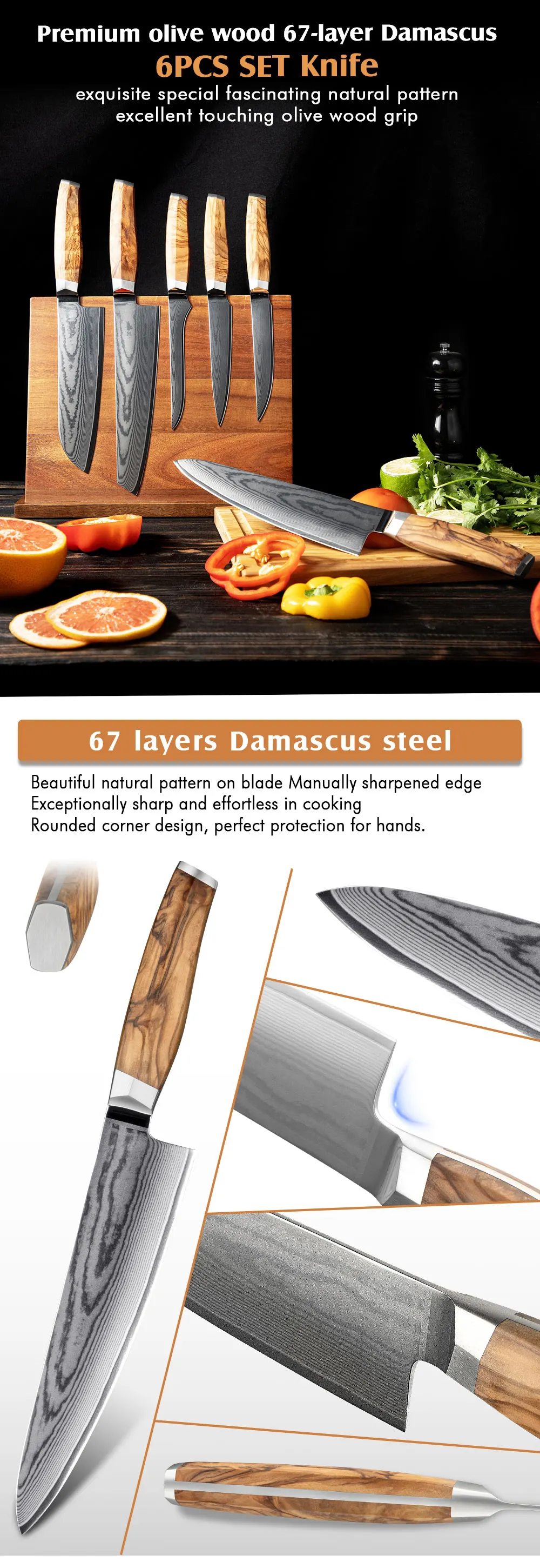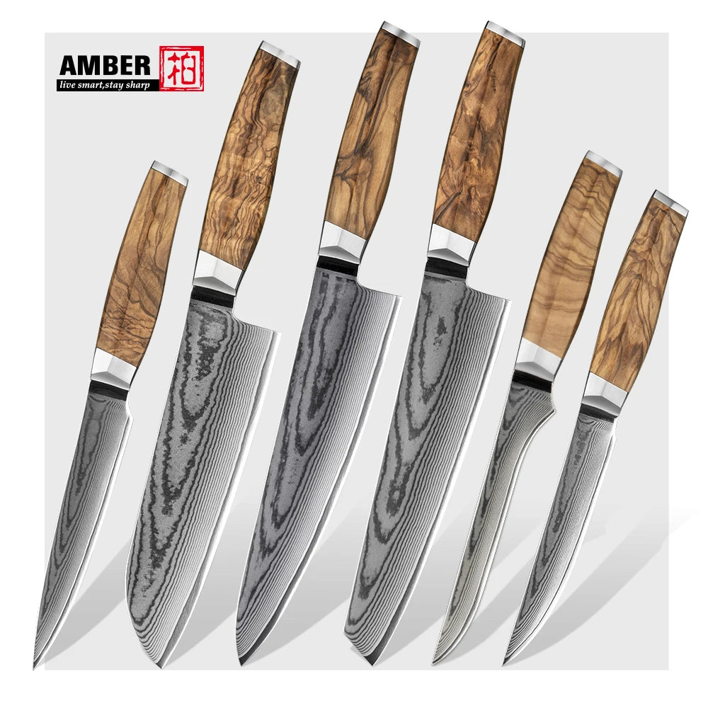 Amber Professional Olive Wood Handle japanese damascus 6pcs knives set kitchen chef utility fruit paring knife chef knife set
