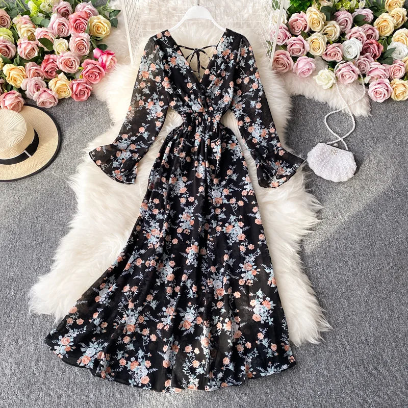 ANSZKTN New Korean Style Floral Print Long Sleeve Casual A Line V Neck Dresses Women Lady Elegant