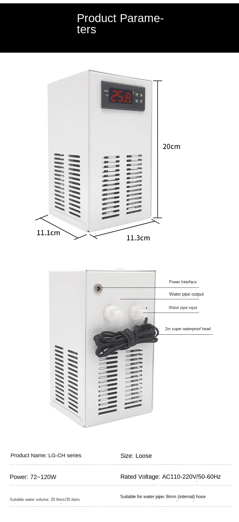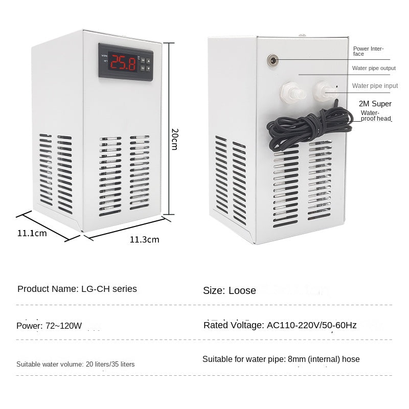 Note: 20L chiller is best for water volume less than or equal to 15L 35L chiller is best for water volume less than or equal to 30L The above water quantity is non-back filter tank, including some landscape objects such as sand and stones in the fish tank. The cooling of 20-60 liter chiller is 3-5 degrees lower than the normal temperature. The less water, the better the effect Tank liter calculation: your tank size length * width * height cm/1000 Please purchase the water cooler according to the corresponding specifications. If the fish tank is too big, the effect of buying a small model will not be ideal. Thank you for your understanding and support. Specifications. Style: single cooling/ Cool and Warm Applicable months: March-October Size: 20*11.3*11.1cm Weight: 2.5kg-3kg Color: white Material: metal Model: LG-C20 Rated voltage: AC110-220V Power: 20L 72W, 35L120W Suitable for water: 1-3L/min Suitable for water pipe: inner diameter 8mm Structure type: sealed type Product accessories: pump * 1 water pipe 2m * 1 power cord * 1 manual * 1