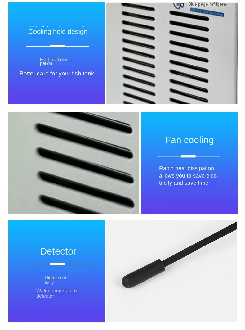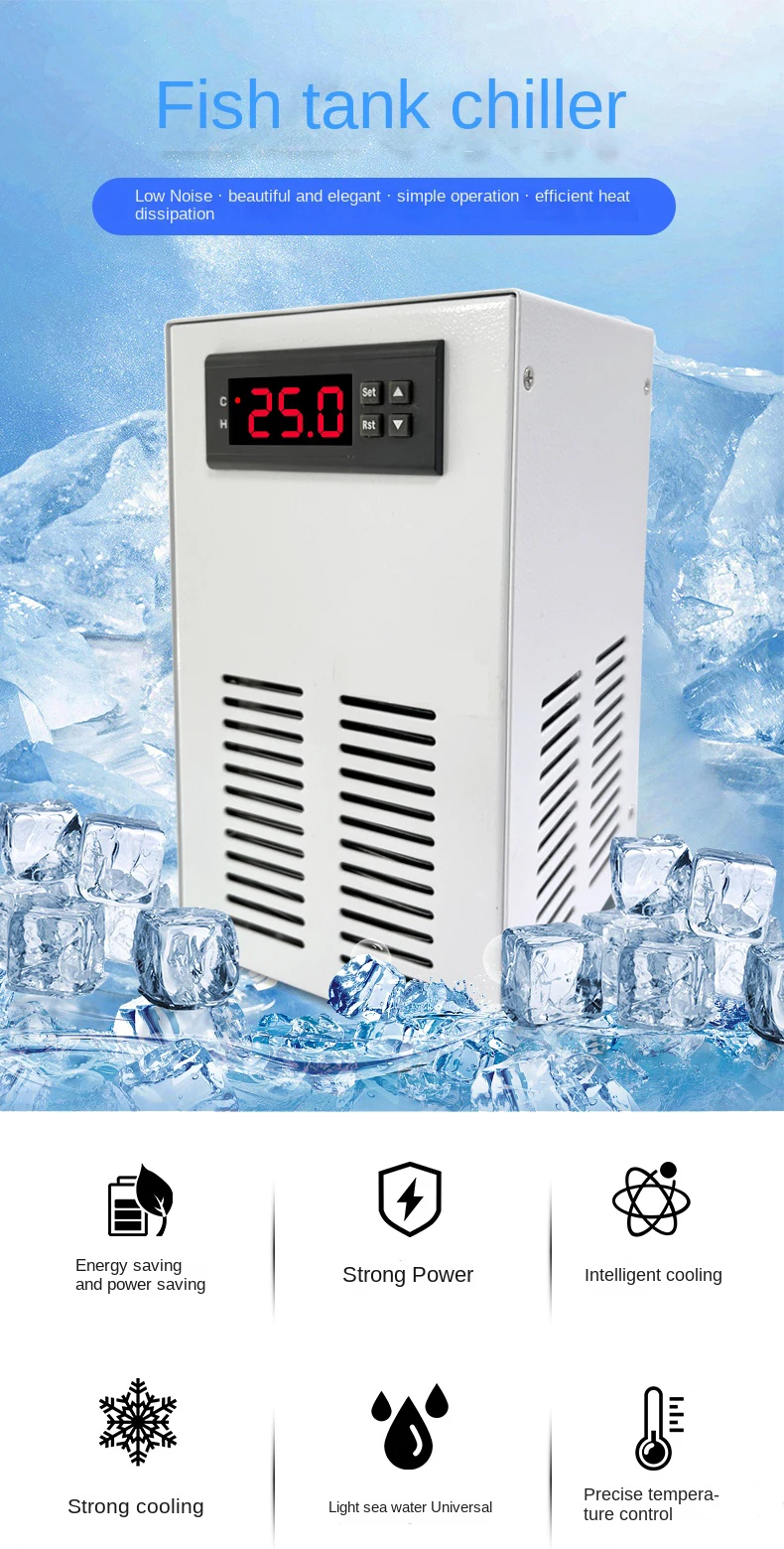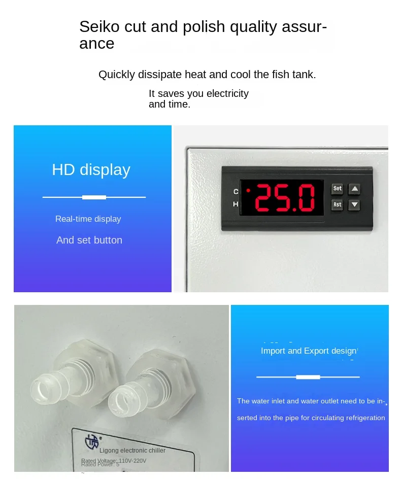 Temperature setting with one key, adjustable temperature range: 0-50 degrees Celsius (℃), to ensure that the water temperature within a certain range, the chiller with LCD display, the recommended temperature of 25 ℃, easy and simple to operate, so that the fish play happily at the appropriate temperature