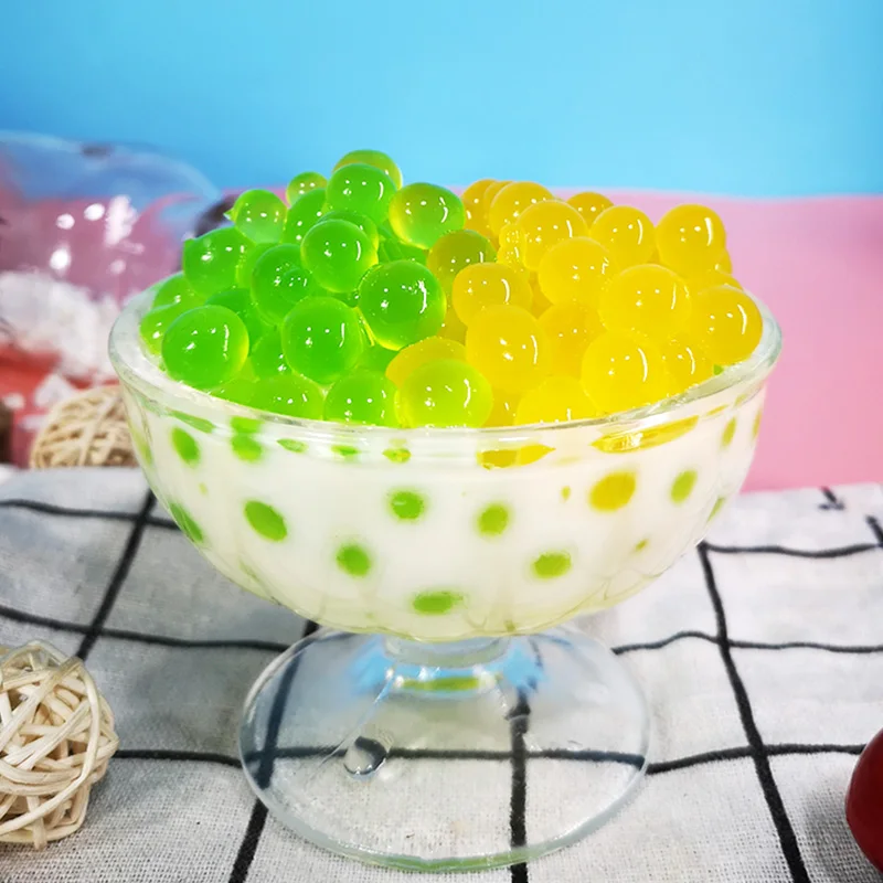 Food grade sodium alginate in raw materials chemically reacts with food grade calcium chloride in water and solidifies into a spherical shape.