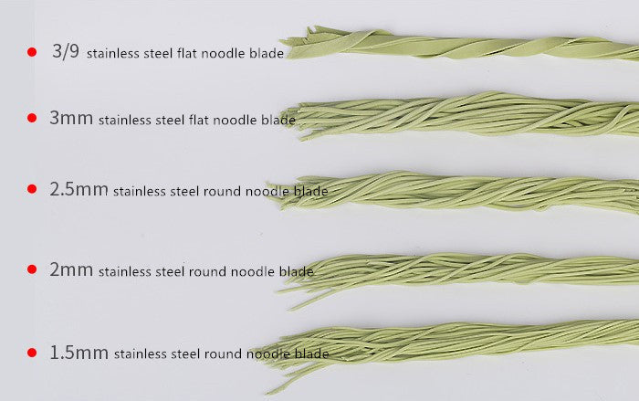 1.Standard noodle cutter: 3/9mm cutter. Other cutters can be choose: Flat noodle cutter: 2/6mm, 18mm. Round noodle cutter:1.5mm,1.8mm,2.5mm.