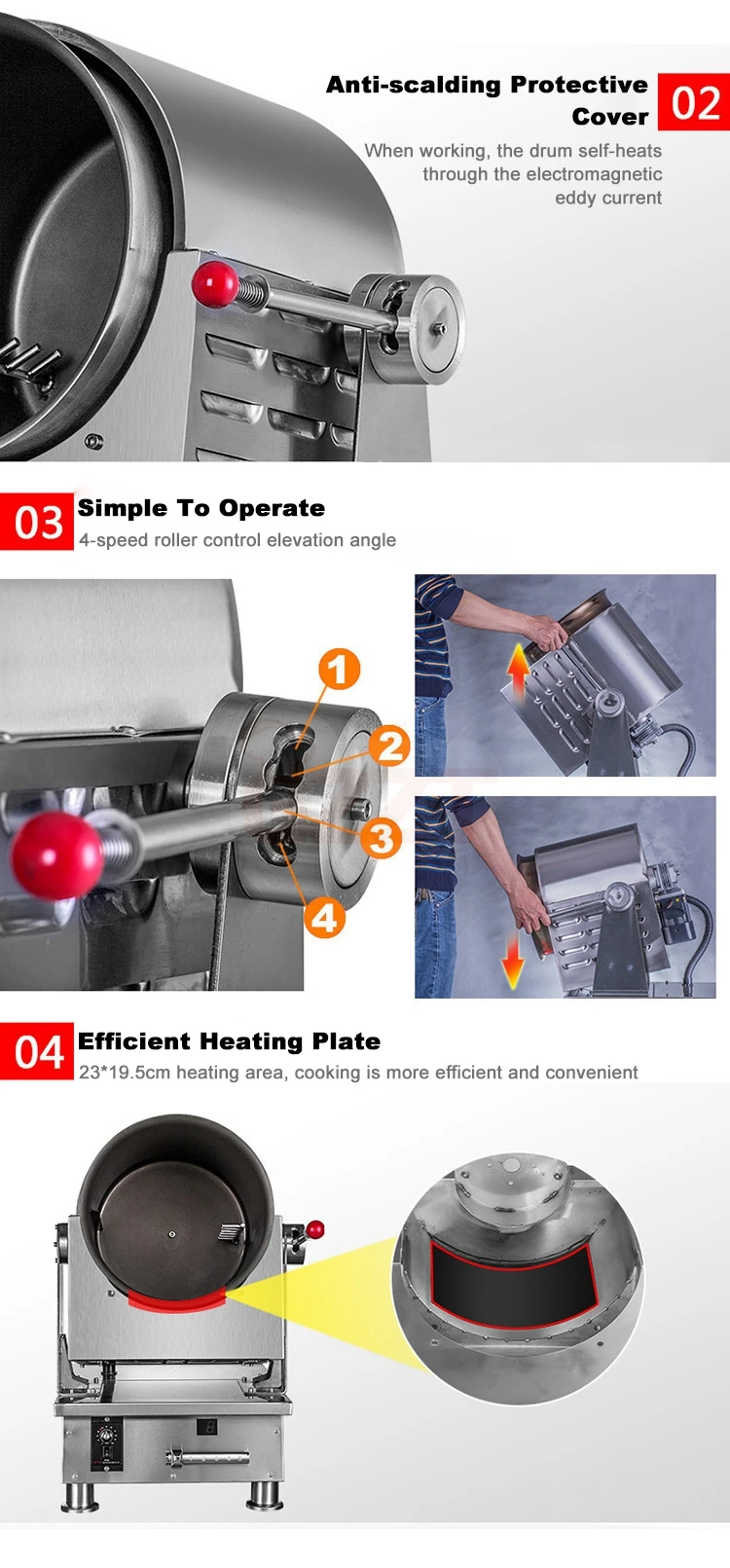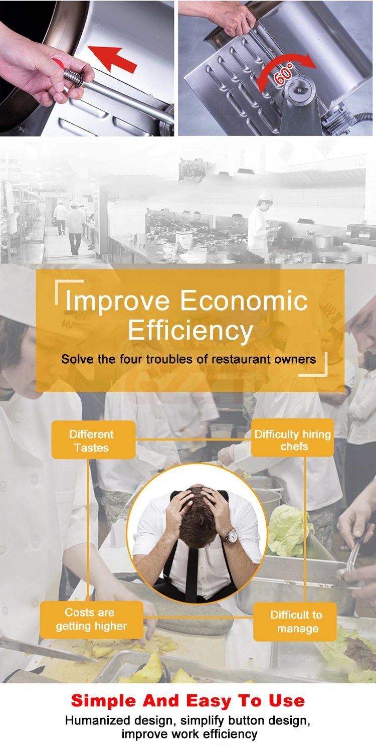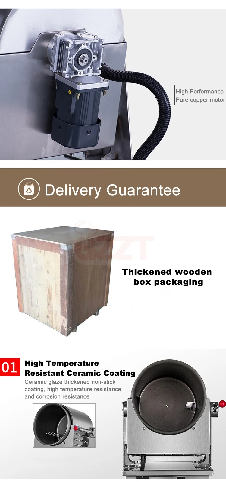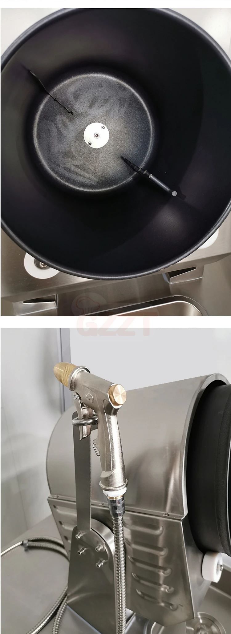 ♦ The pot body has no coating, which is more resistant to burning, so there is no need to worry about the coating falling off. ♦ Desktop lightweight, quiet operation, no vibration. ♦ Small size, simplifies the layout of the kitchen space. ♦ The whole machine has no exposed pipelines, and the streamlined structure design is convenient for cleaning and maintenance. ♦ Adopt ergonomic design, easy and labor-saving operation. ♦ Anti-skid handle for pan lift. ♦ The pot turns stepless speed adjustment, the fastest is 40 rpm. ♦ Knob fire control. ♦ Greatly reduce the labor intensity of chefs and reduce the probability of various occupational diseases of chefs