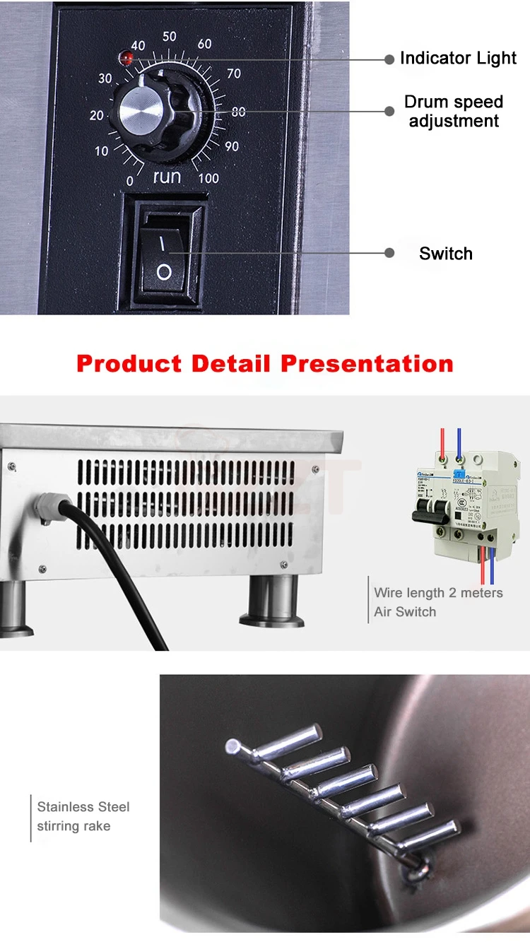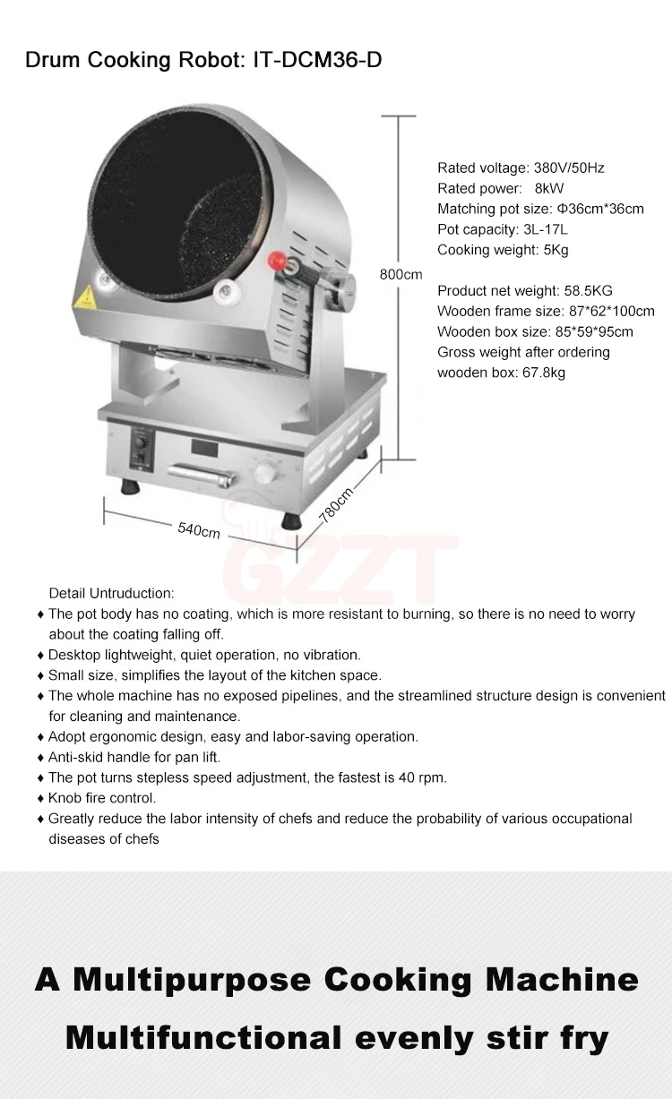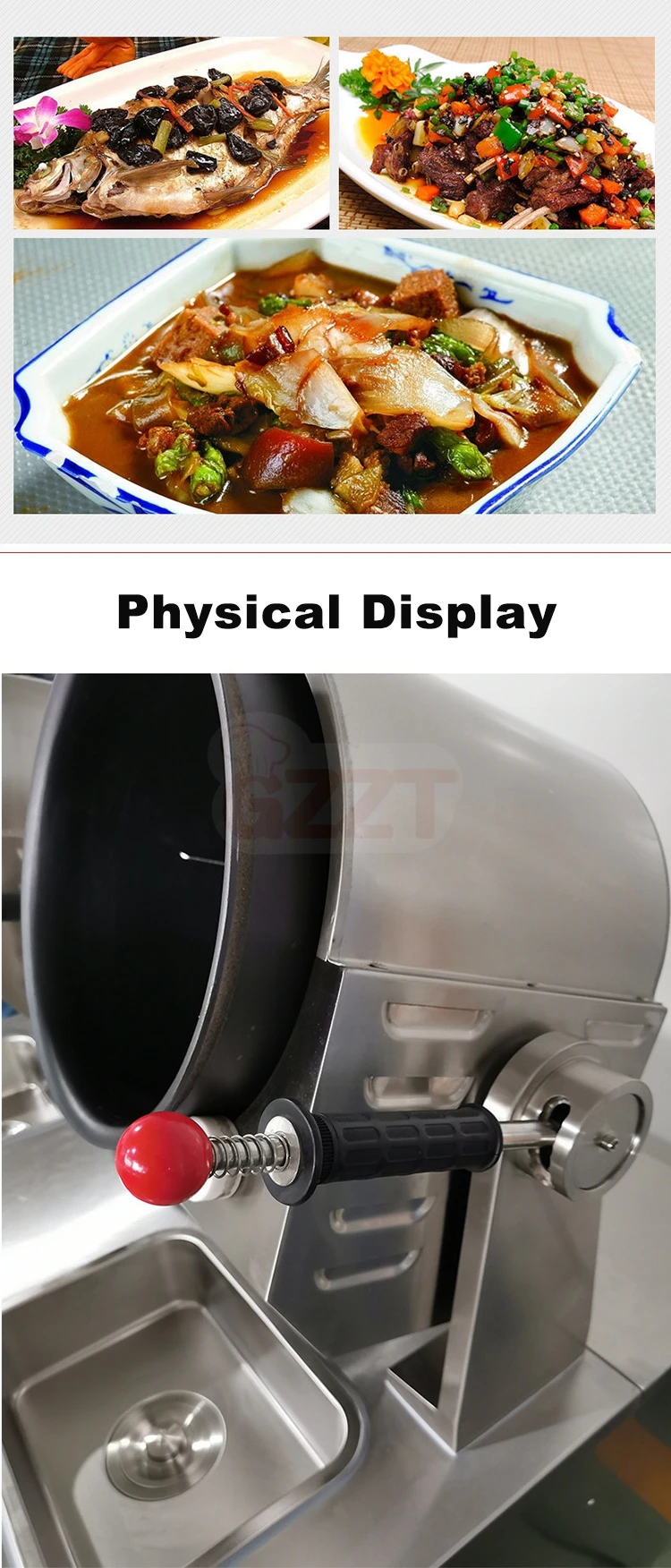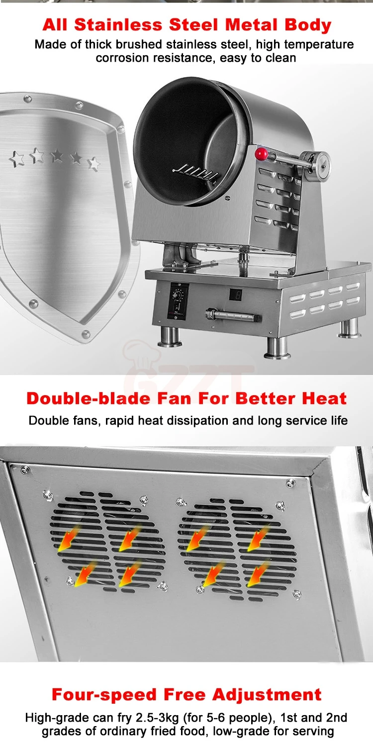 ♦ The pot body has no coating, which is more resistant to burning, so there is no need to worry about the coating falling off. ♦ Desktop lightweight, quiet operation, no vibration. ♦ Small size, simplifies the layout of the kitchen space. ♦ The whole machine has no exposed pipelines, and the streamlined structure design is convenient for cleaning and maintenance. ♦ Adopt ergonomic design, easy and labor-saving operation. ♦ Anti-skid handle for pan lift. ♦ The pot turns stepless speed adjustment, the fastest is 40 rpm. ♦ Knob fire control. ♦ Greatly reduce the labor intensity of chefs and reduce the probability of various occupational diseases of chefs