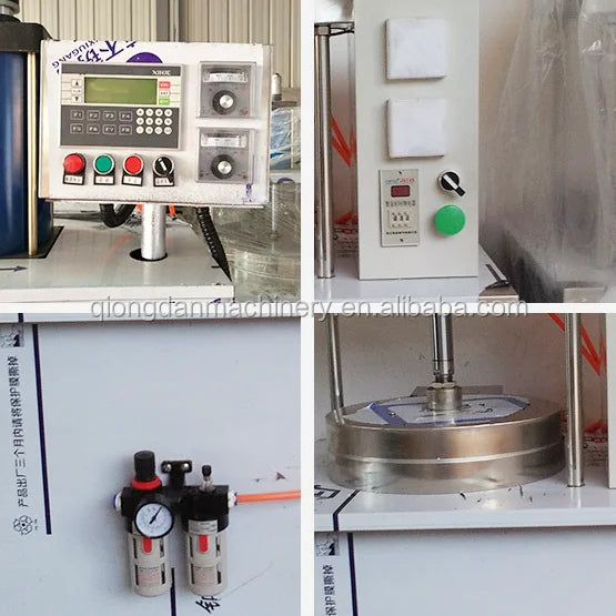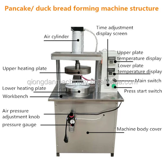 The main structure consists of a frame, pneumatic components, electrical components, heating elements and forming dies. Start the power switch to heat up and start working when the temperature reaches the set operating temperature.Place quantitative dough on the heating mold, start the mold switch, then the upper mold will press automatically. When the heating is completed, the upper mold automatically rises and resets.