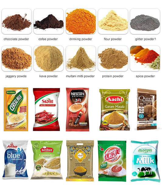 GOLDSEN Powder Packing Machine Is Suitable For Packing Various Kinds Powder ,Like Coffee Powder ,Milk Powder, Chocolate Powder,Spice Powder ,Seasoning Powder ,Protein Powder,Cocoa Powder, Masala Powder , Chili Powder, Curry Powder , Soup Powder , Coconut Powder, Ice Cream Powder ,Etc.According To Customer'S Request , The Bag Type Can Be Changed To Back Sides Seal , Three Sides Seal And Four Sides Seal . However,One Machine Is Only Able To Pack One Kinds Seal Form.