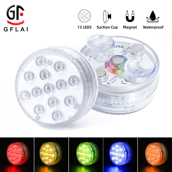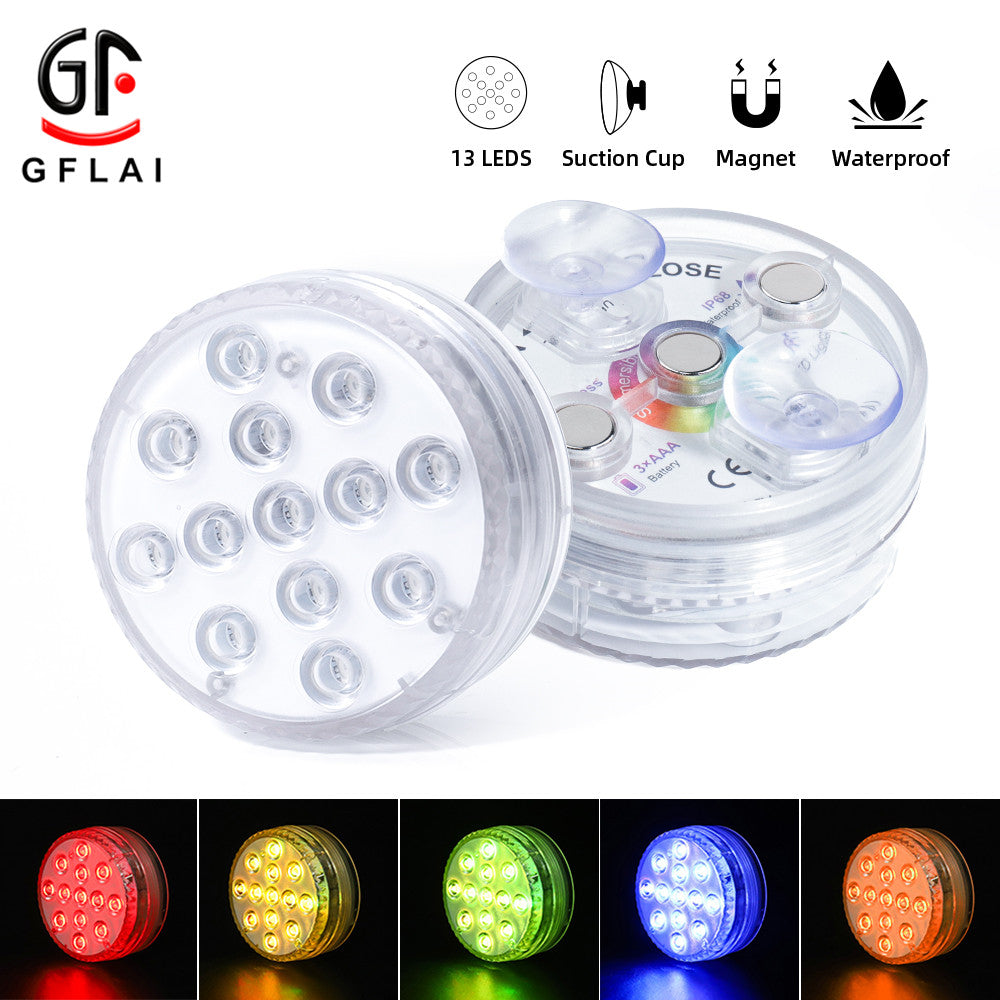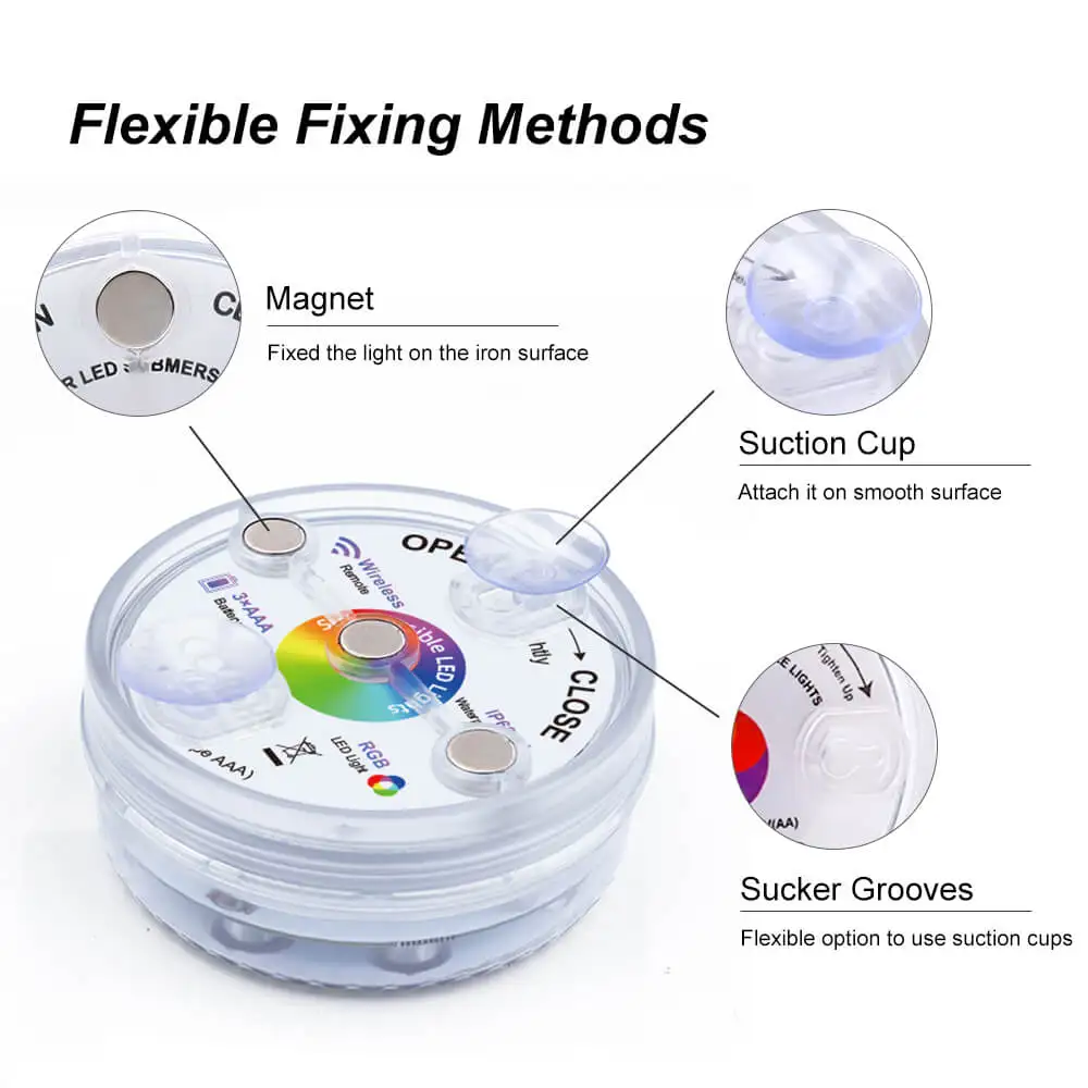 Our Swimming Pool Led Lights are made of high-quality ABS material. There are 3 battery slots and 13 LED lights inside the Diving Light. The shell contains a waterproof ring, which can better prevent water from entering the Rgb Submersible Led Lights. There are 3 magnets and 2 suction cups outside the shell of the Swimming Pool Led Lights, which can make the diving light better adsorb on the iron rod or the pool wall. Suction cups are replaceable. This Diving Light has 16 colors and 3 light flashing modes. This submersible LED light comes with a 21-button remote control. The RGB Submersible Led Lights can change color, light flashing mode, and light intensity through the remote control.