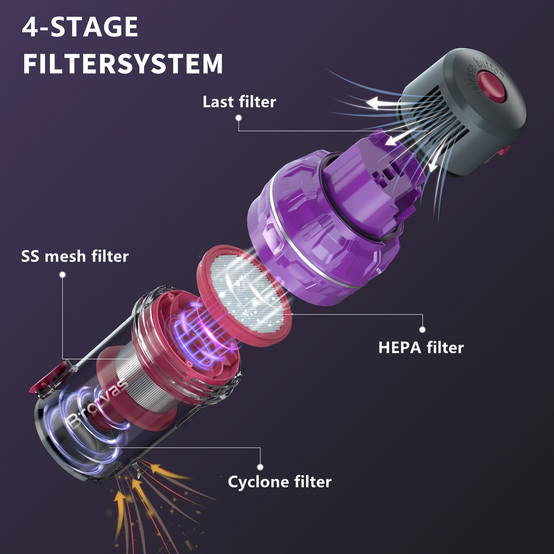 Detachable battery, extension tube, with LED headlight, extra soft roller brush, two piece HEPA filter, hose.