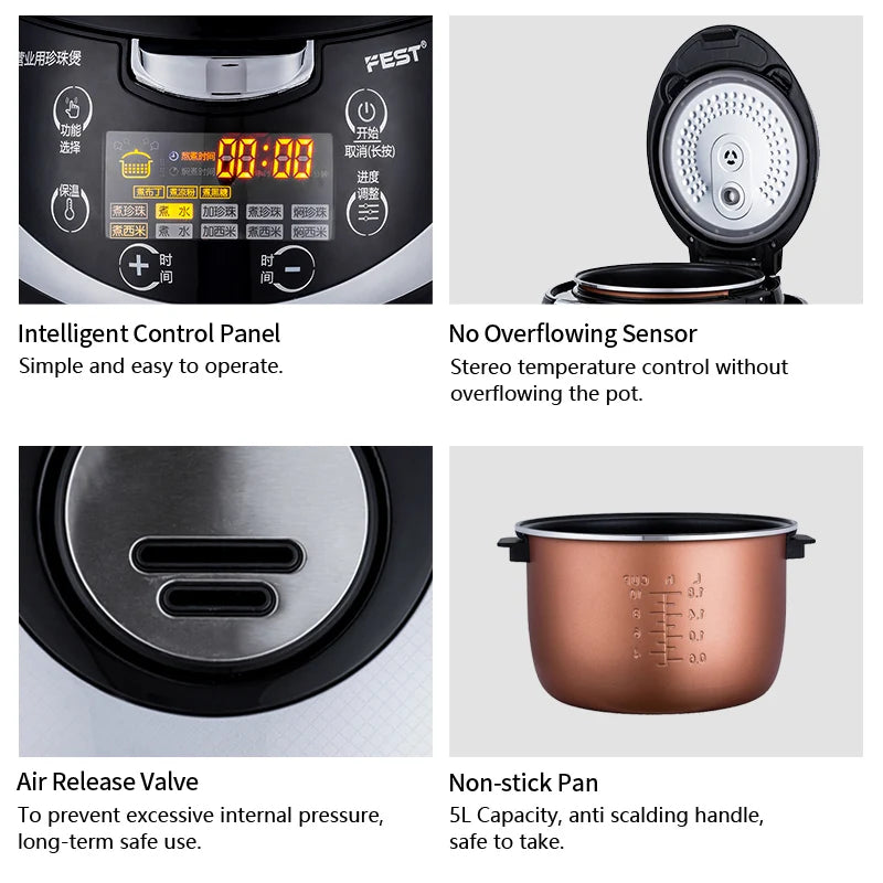 Commercial tapioca cooker: 1, 5 liters large capacity, can cook up to 500g-1kg tapioca balls 2, precise temperature control, to ensure that the pearl is fully boiling 3, micro-pressure technology, efficient and uniform heating, reducing water loss 4, the operation is simple and convenient, the cooking process is easy.