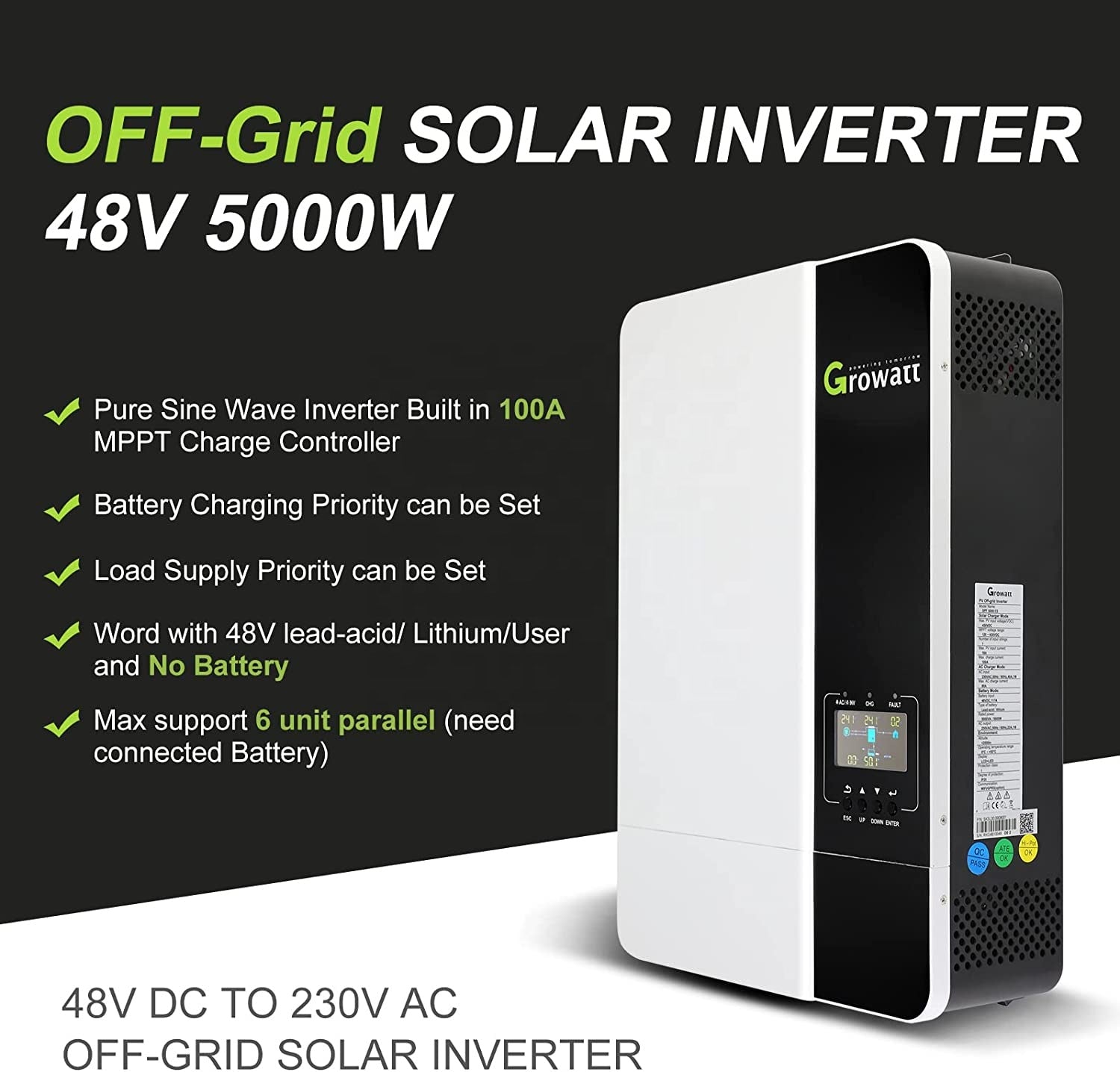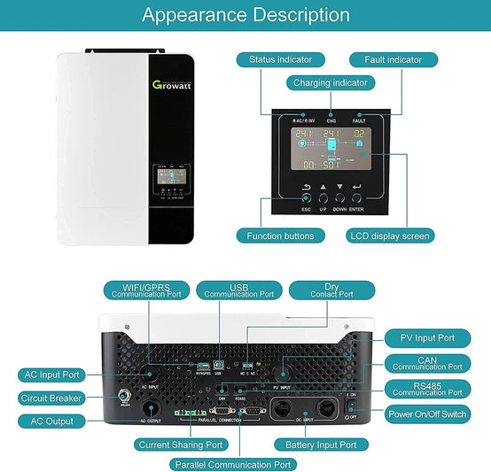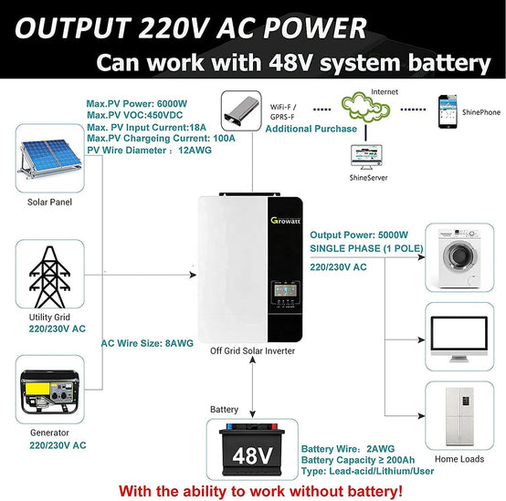All-in-on Solar Inverter, Max.PV Power:6000W, Max.PV Input Current: 18A, Max.PV Input VOC: 450V DC, PV Wire:10-12AWG, Max PV Charging Current: 100A (mppt controller to battery)
