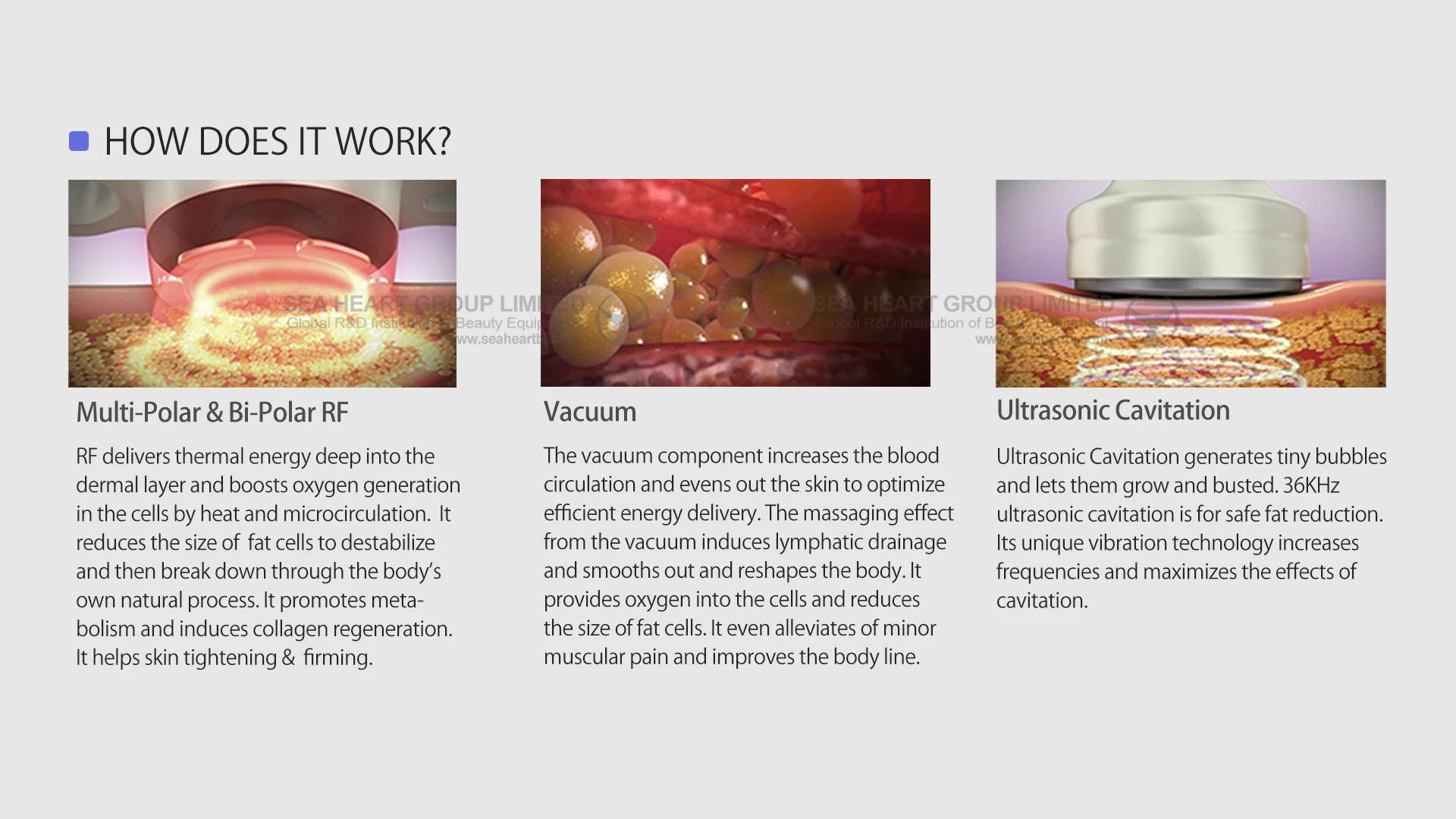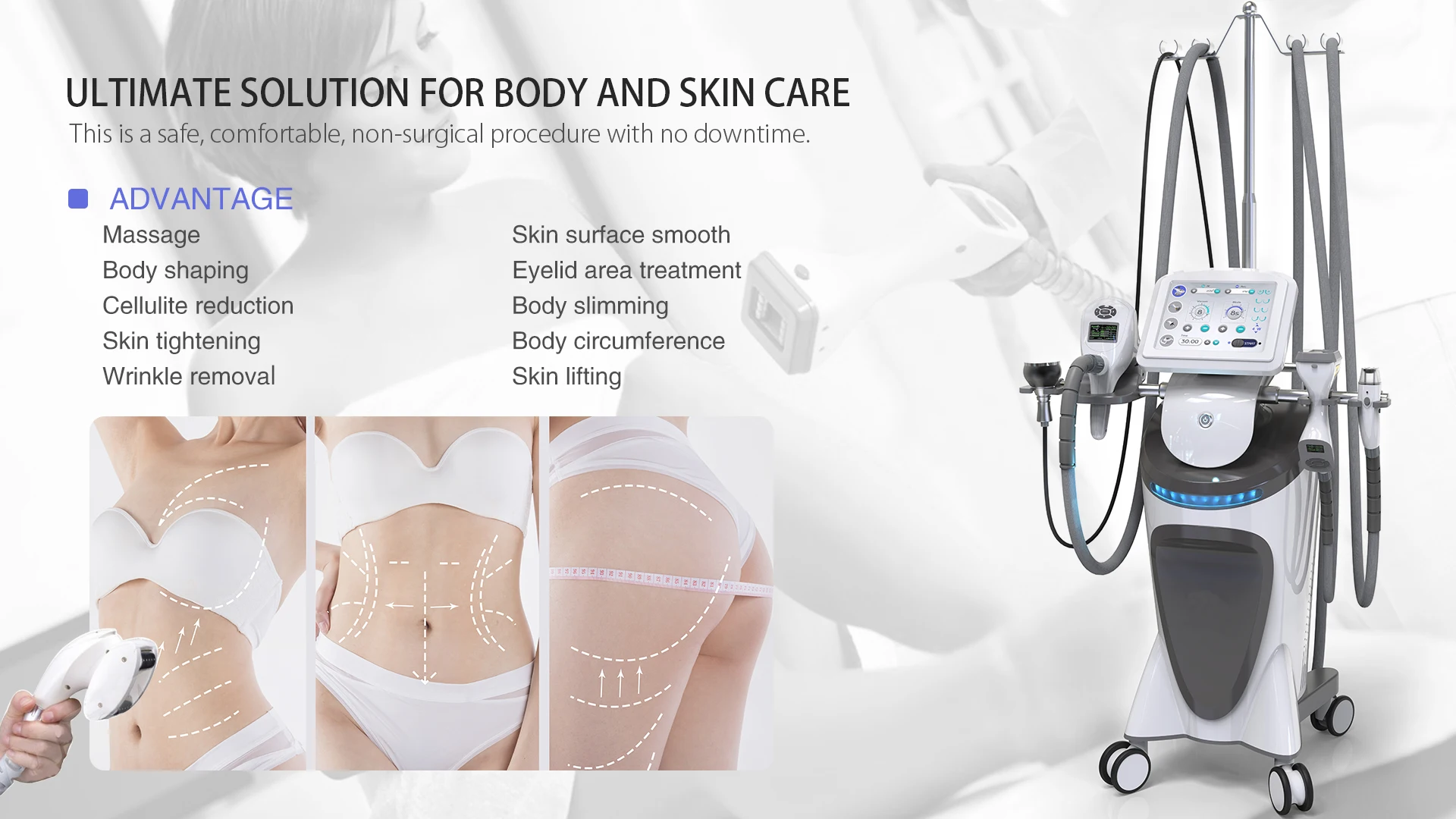 Scope of Treatment: Body Contouring ; Cellulite Removal ; Body Slimming ; Circumference Reduction ; Skin tightening ; Face Lifting, Wrinkle removal ; Skin Texture & Tone.