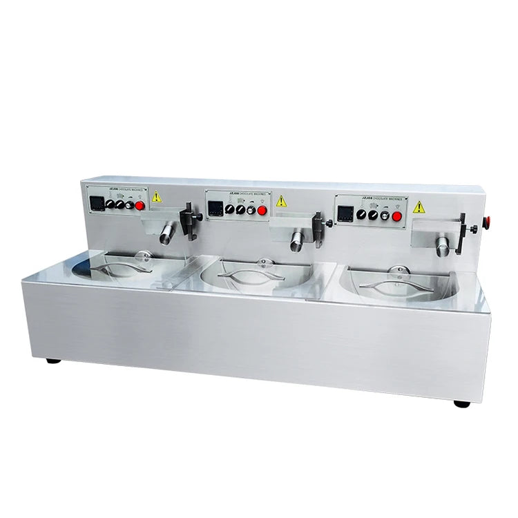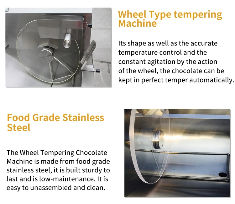 Adopted fully stainless steel wire drawing production,it is totally conformed with food standard.Siemens sensor ensure the electric control sensitivity and temperaturepreserve efficiency,which enable the uniform chocolate tempering.With compact structure, tempering casting machine is easy to be installed with humanized design and vibration function which makes the chocolate is more beautiful.This machine has the function of adjusting temperature.